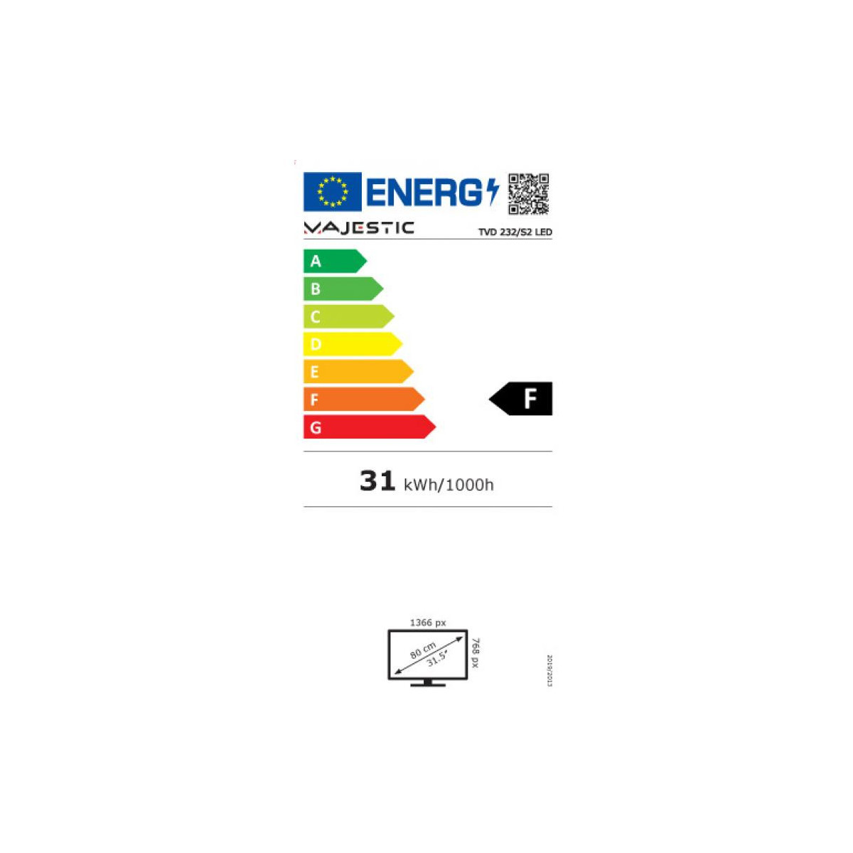 New Majestic TVD-232 S2 LED V4. Dimensioni schermo: 81,3 cm (32"), Tipologia HD: HD, Tecnologia display: LED, Forma dello schermo: Piatto, Luminosità schermo: 1800 cd/m², Tempo di risposta: 8 ms, Rapporto di contrasto: 3000:1. Formato del segnale digitale: DVB-C, DVB-T, DVB-T2. Colore del prodotto: Nero