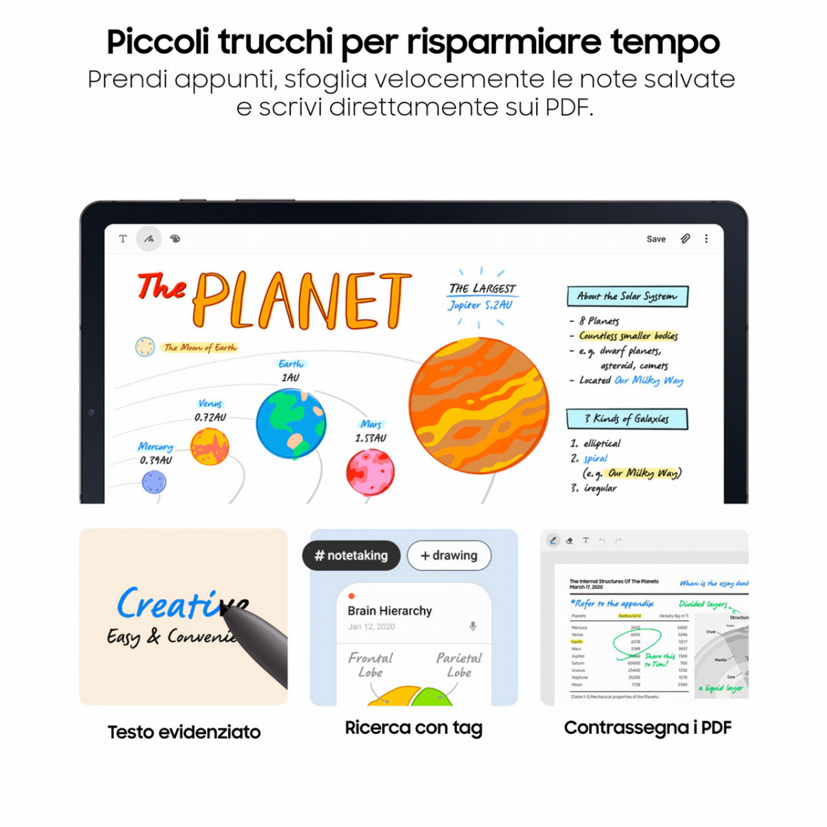 S Pen racchiude in un unico dispositivo tanti strumenti di scrittura diversi. L’impugnatura ergonomica, la bassa latenza e l’incredibile sensibilità alla pressione la rendono il complemento perfetto per disegnare e modificare documenti. E grazie al supporto magnetico del tablet non rischierai mai di perderla.