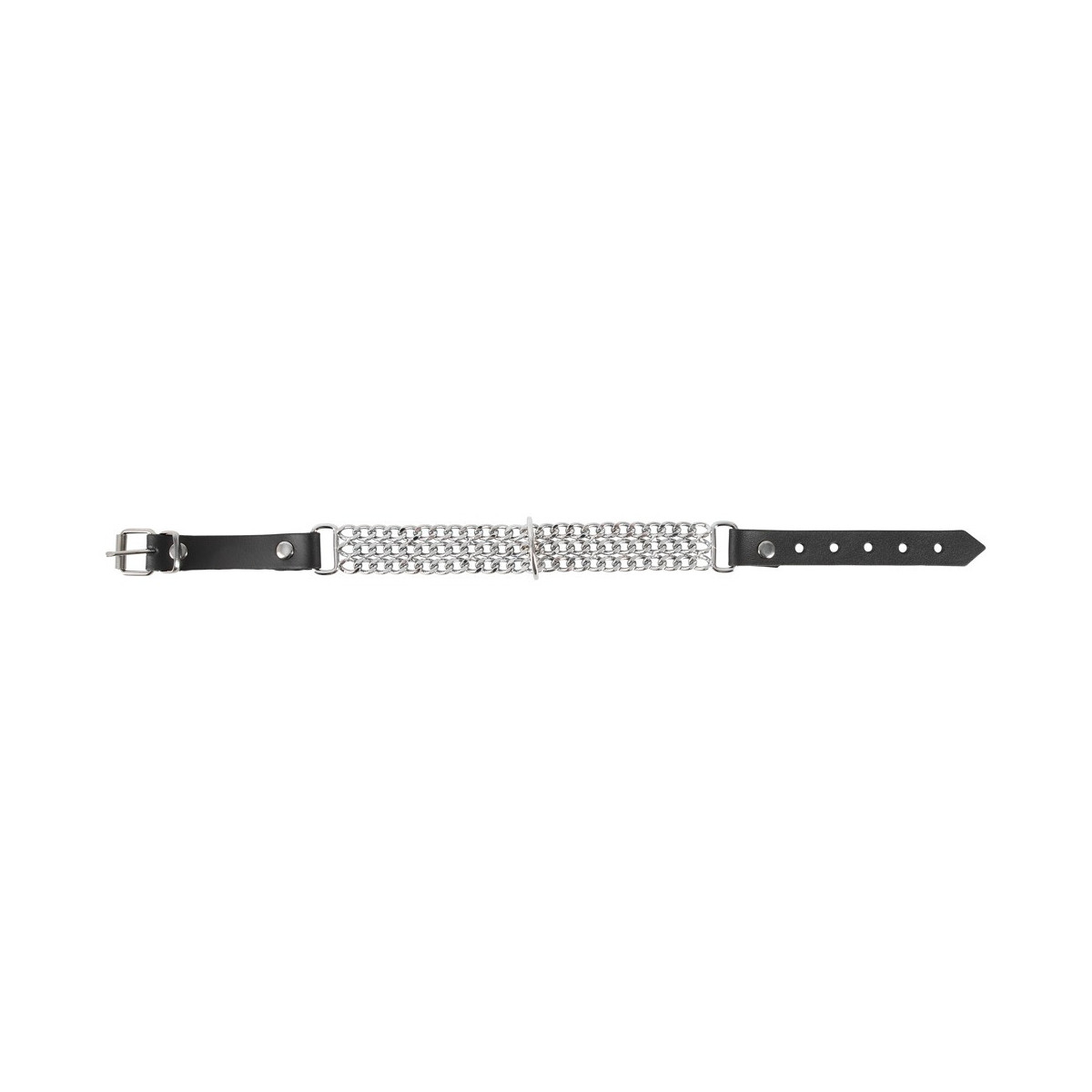Polsino da collo in pelle nera con tre catene a maglie metalliche, a cui è attaccato un anello di collegamento, che attende la linea guida... Regolabile con chiusura a fibbia. Materiale: pelle crosta, metallo.