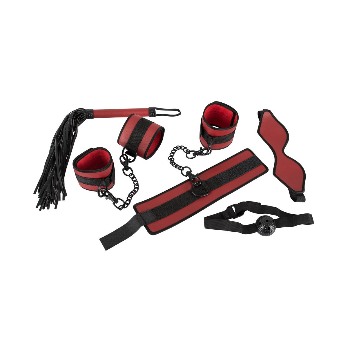 Set bondage di Bad Kitty con 5 pezzi: maschera opaca per gli occhi, bavaglio alla bocca con fori di respirazione (Ø 3,5 cm), comoda frusta, manette e cavigliere.