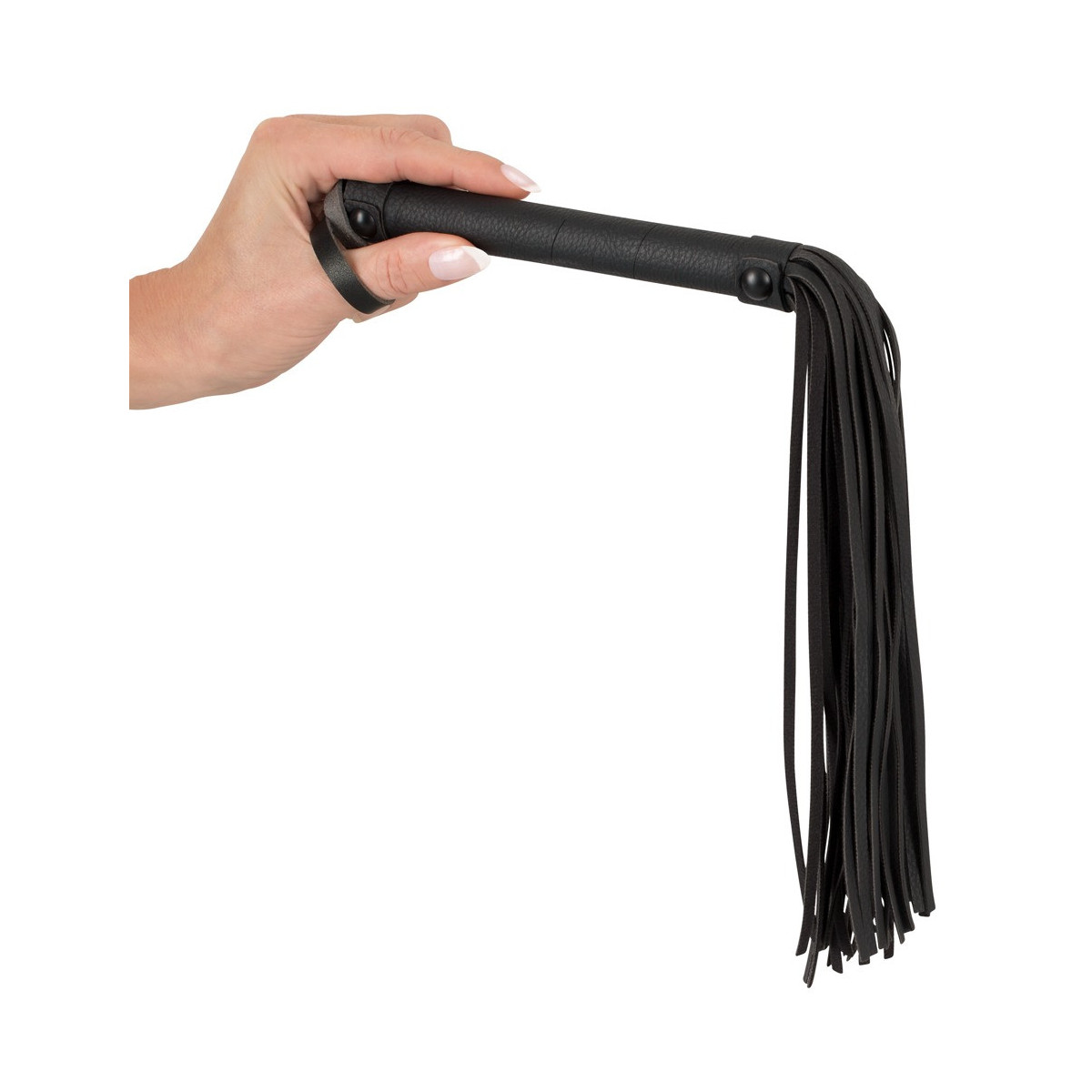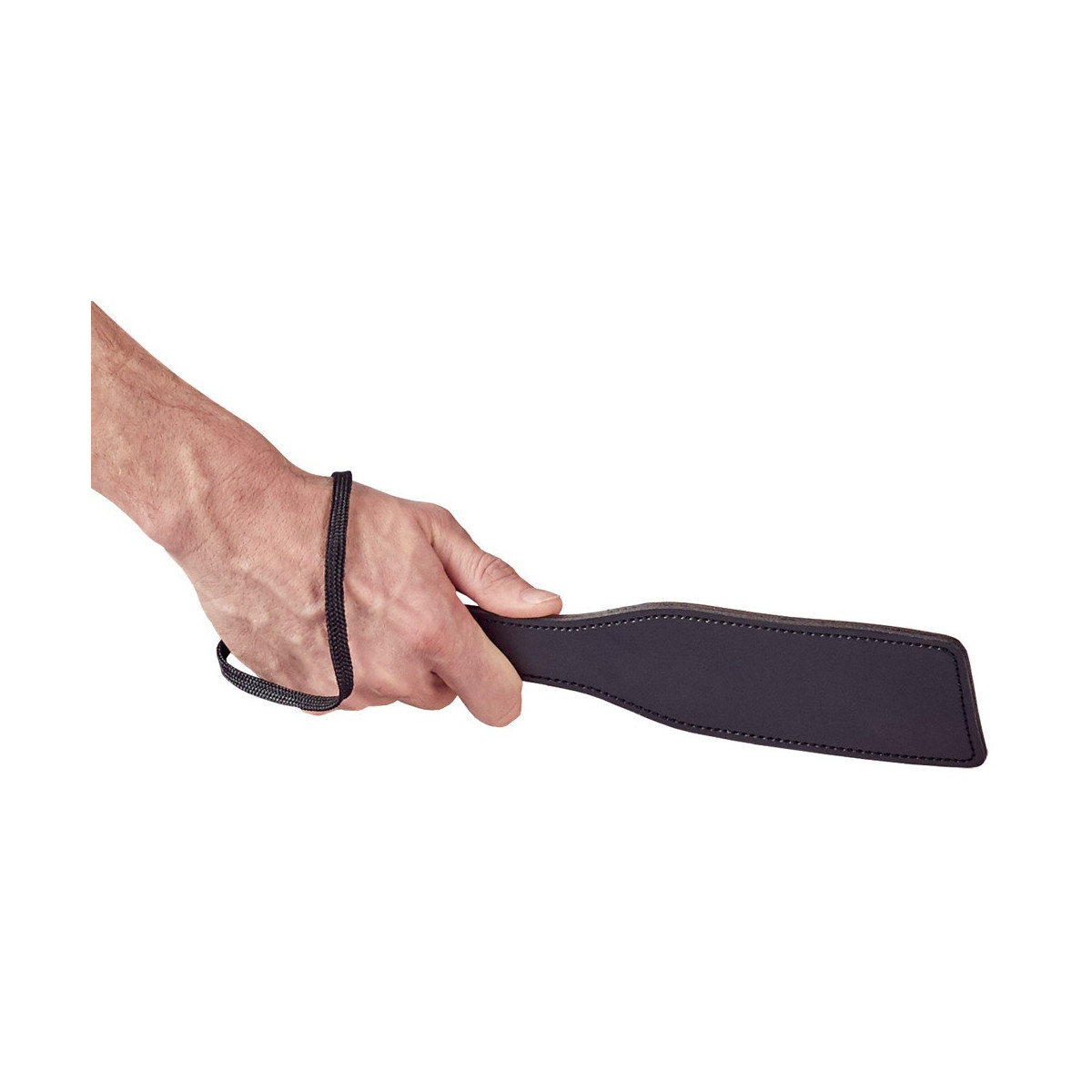 Guinzaglio 1m, bavaglio a bocca Ø 3,5 cm, frusta 38 cm, paddle 27 cm.