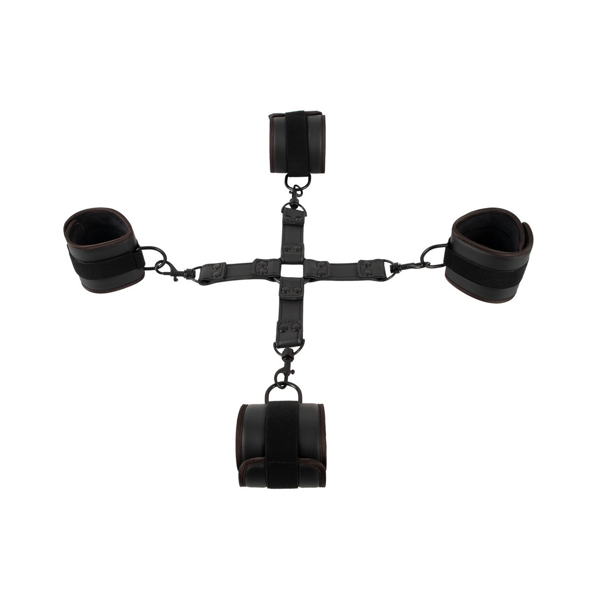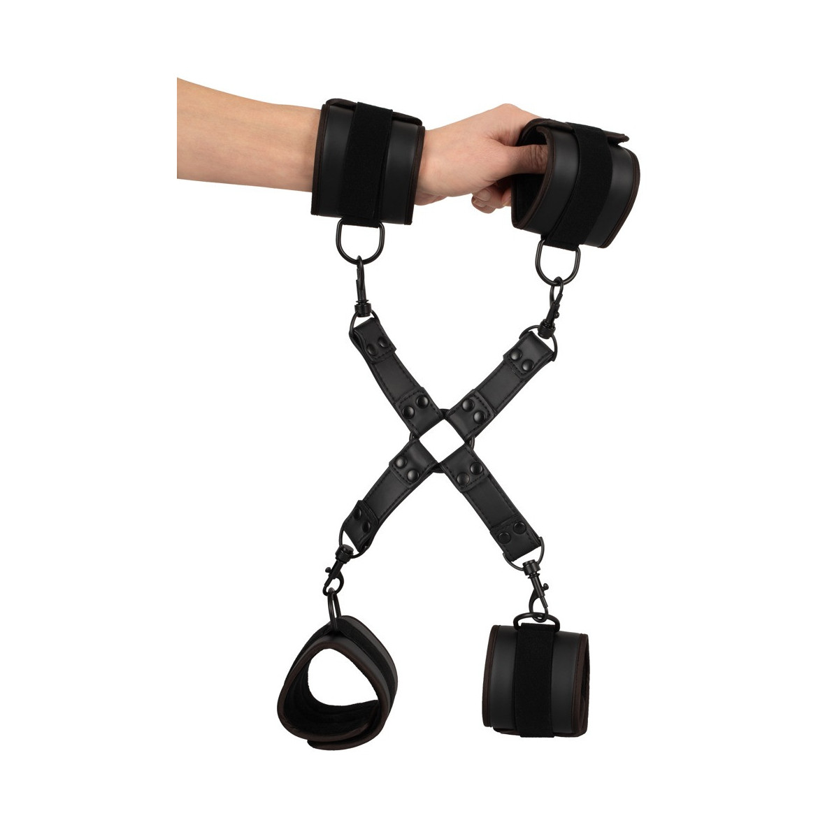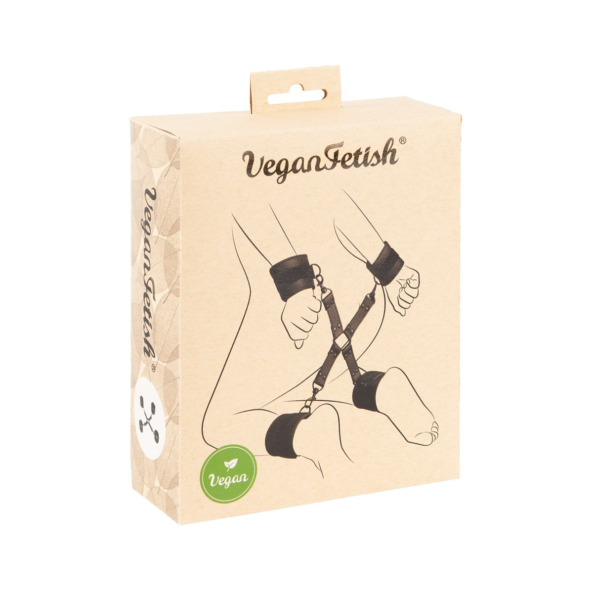 Set bondage di alta qualità composto da manette per mani e piedi e da un hogtie. Tutto in un elegante look in pelle, ma vegano in tutto e per tutto! Polsini per mani e caviglie leggermente imbottiti e regolabili con chiusure in velcro per lui e per lei. Hogtie cross con moschettoni ad ogni estremità per un facile e comodo fissaggio agli anelli delle manette per mani e caviglie.