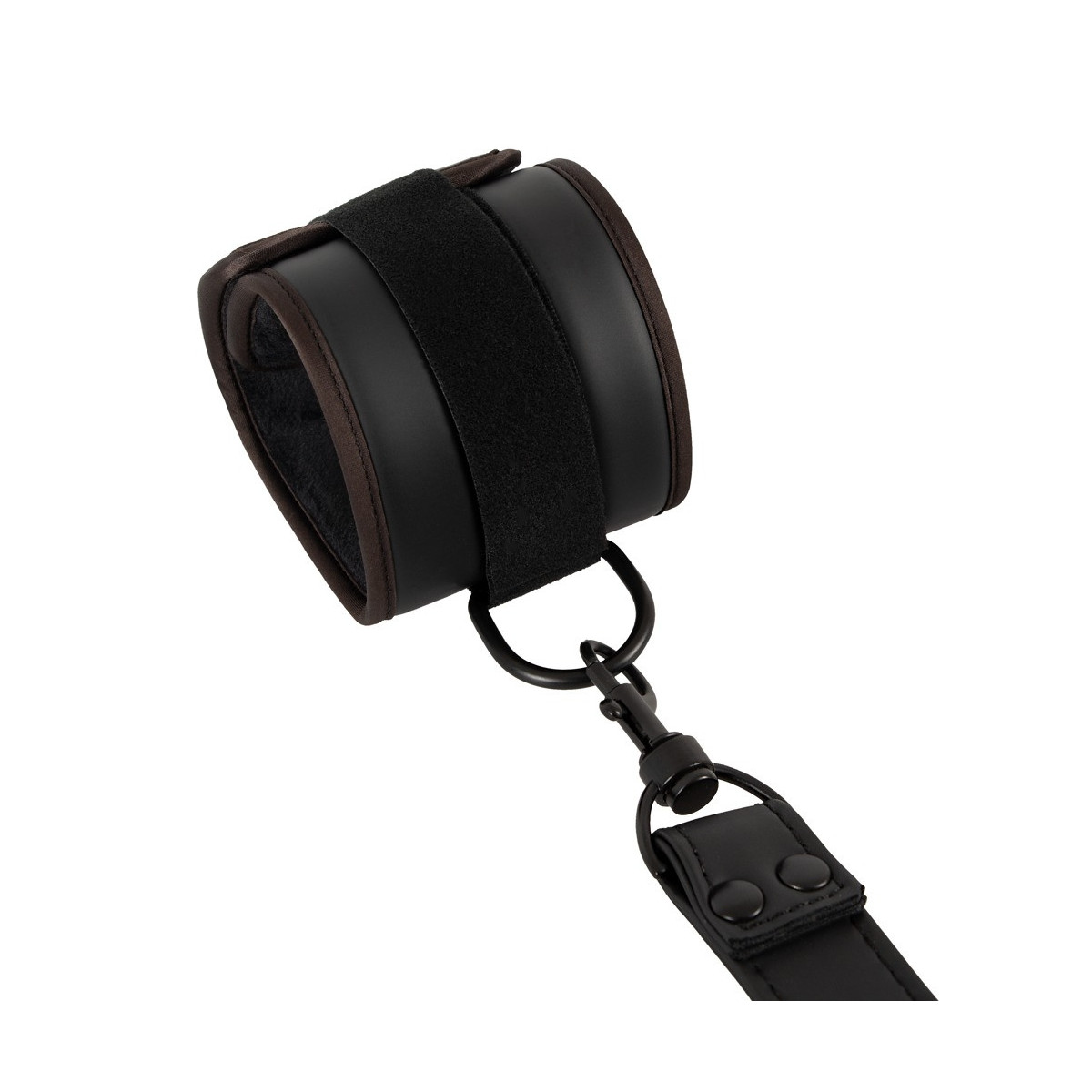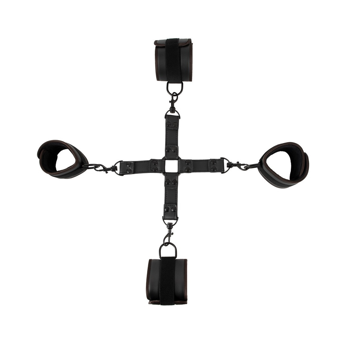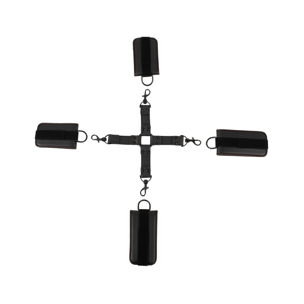 Set bondage di alta qualità composto da manette per mani e piedi e da un hogtie. Tutto in un elegante look in pelle, ma vegano in tutto e per tutto! Polsini per mani e caviglie leggermente imbottiti e regolabili con chiusure in velcro per lui e per lei. Hogtie cross con moschettoni ad ogni estremità per un facile e comodo fissaggio agli anelli delle manette per mani e caviglie.