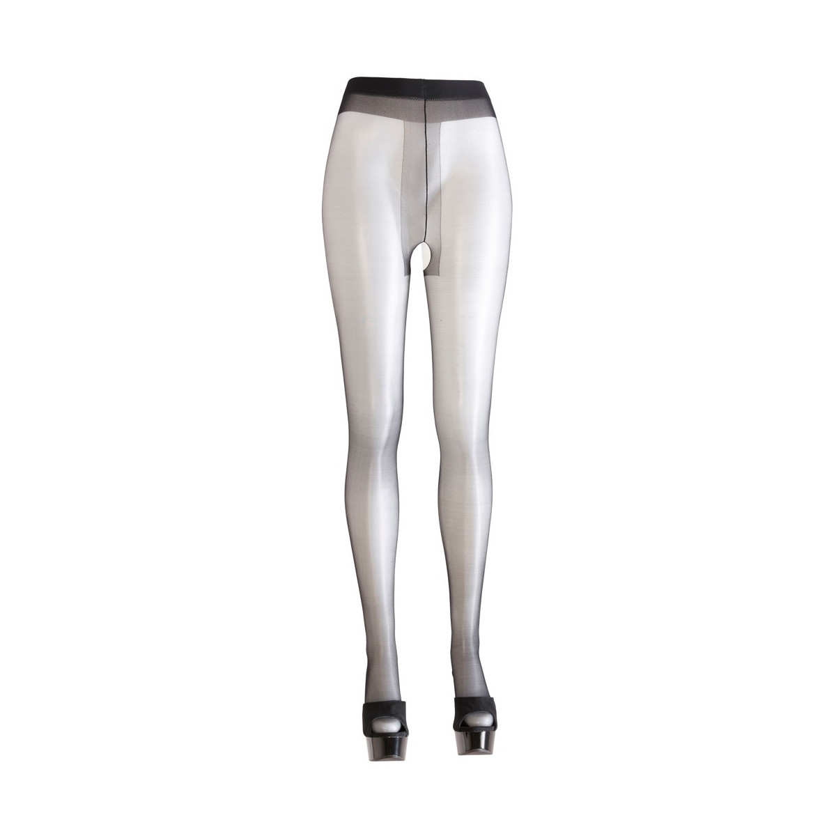 Nero, con brillantezza »Satin Sheer«. Aperto all‘inguine. Piede formato. 89% poliammide, 11% elastan.