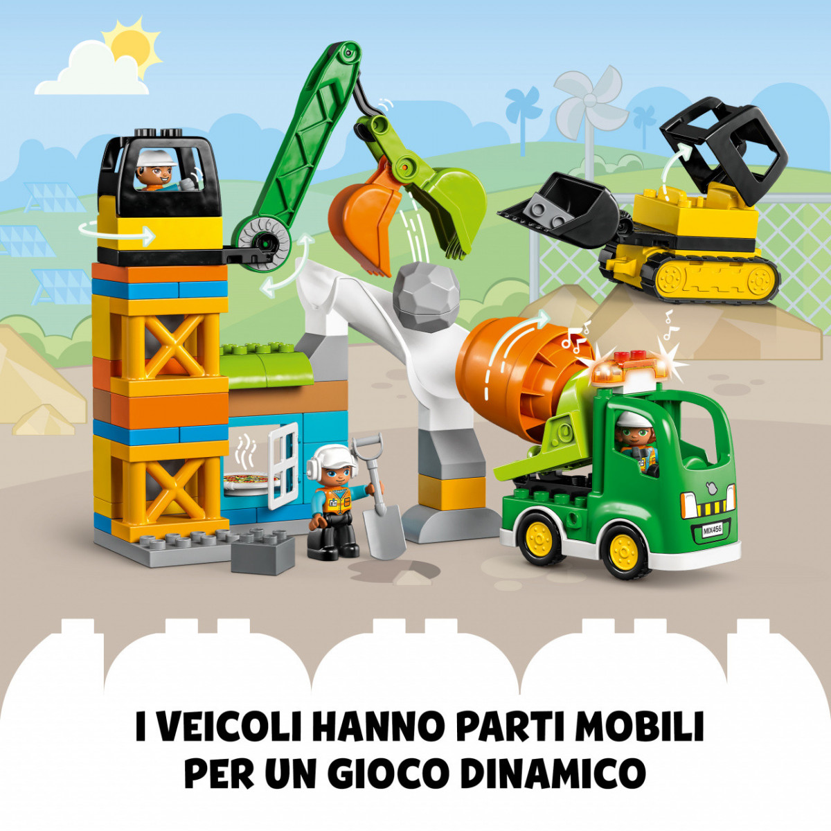 I bambini in età prescolare imparano a lavorare in squadra, grazie ai 3 personaggi LEGO DUPLO dei muratori e ai 3 veicoli presenti: il bulldozer, la betoniera e la gru giocattolo. Il bulldozer LEGO sposta il blocco di cemento, la gru lo afferra e lo trasporta fino alla botola, dove scivola nella betoniera. Finita la fatica, una gustosa pizza premia gli operai edili per il loro ottimo lavoro. Questa costruzione per bambini con i mattoncini LEGO DUPLO assicura lunghe ore di divertimento creativo con tanti oggetti interessanti, che tengono occupate le manine dei piccoli. La gru ha le ruote e le sue ganasce si aprono e si chiudono. Il tamburo della coloratissima betoniera giocattolo gira veramente; la sua sirena emette 3 suoni diversi e le sue luci lampeggiano, per fornire una stimolazione sensoriale.