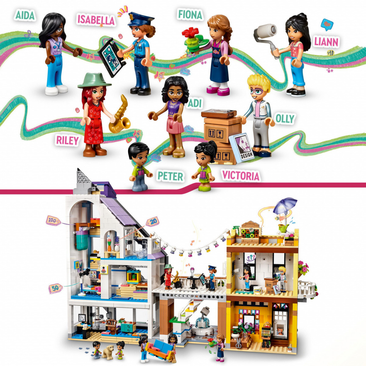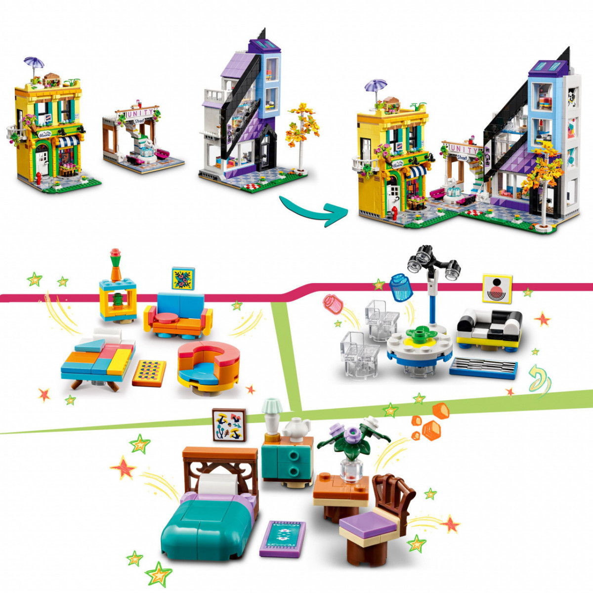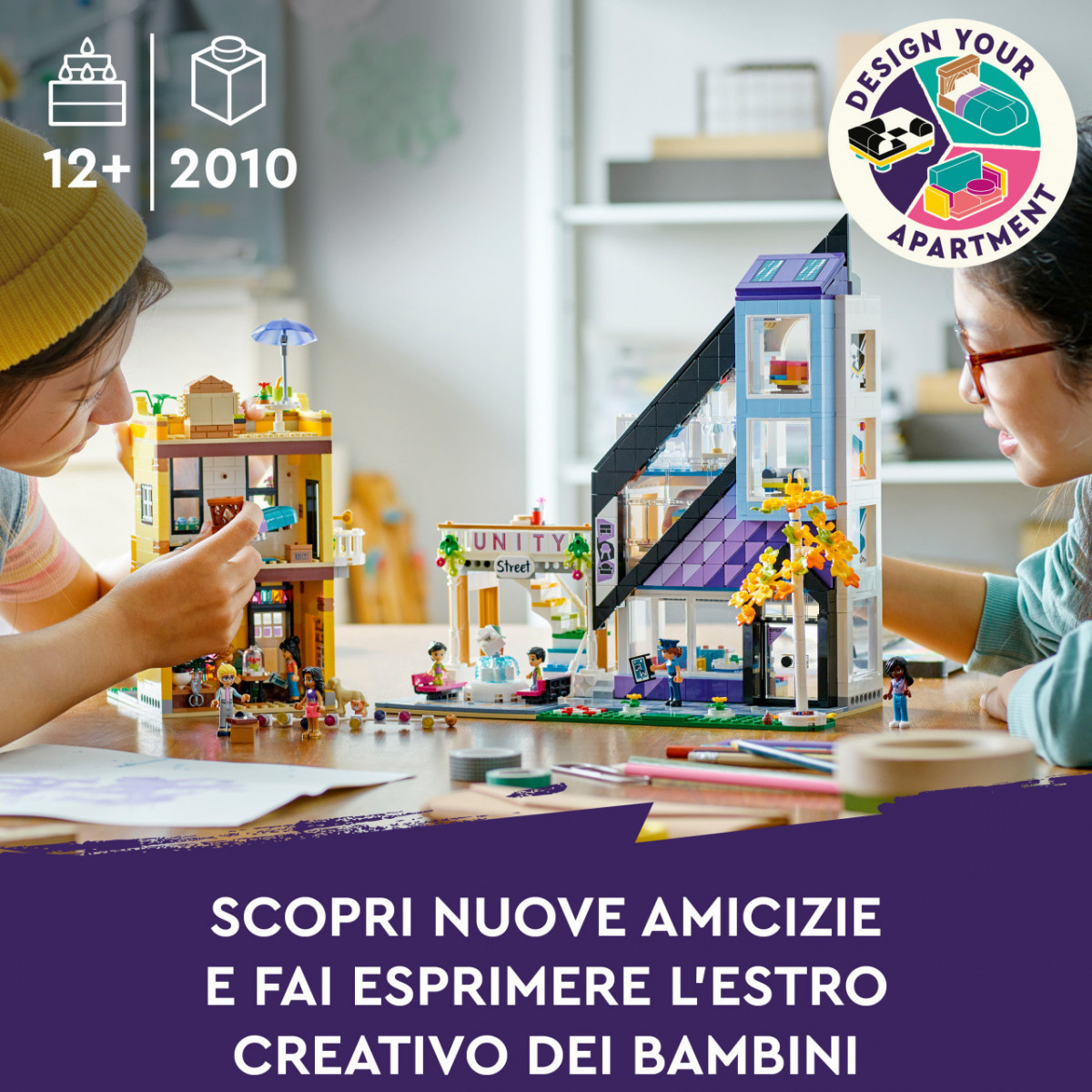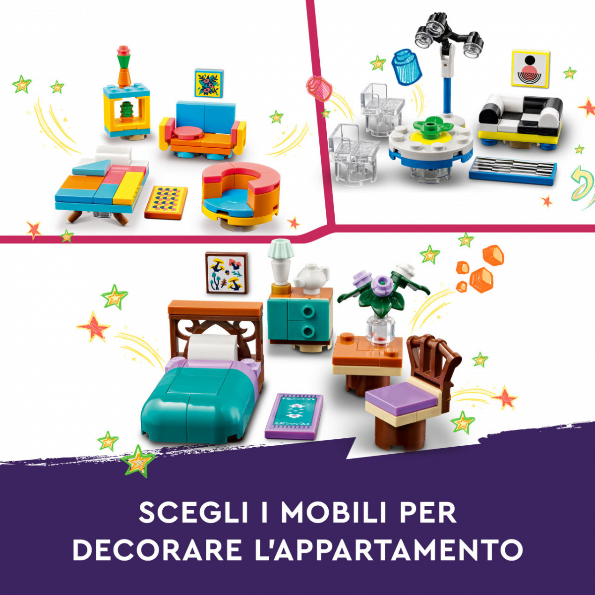 Questo set include 9 personaggi LEGO Friends 2023: un cast di mini bamboline della nuova generazione di Heartlake City, per fantastiche avventure e giochi di ruolo. Aiuta Adi, che si è da poco trasferita, a scegliere come decorare il suo appartamento, e Fiona, che coltiva fiori sul tetto per venderli nel suo negozio. I bambini possono allenare il loro talento di interior designer costruendo e personalizzando questo set modulare LEGO Friends composto da 3 sezioni: il negozio di fiori LEGO Friends, il negozio di mobili e l’appartamento di Adi possono essere disposti in modi diversi, e possono essere caratterizzati ognuno con un proprio stile architettonico. I piccoli potranno anche sbizzarrirsi a scegliere i mobili per l’appartamento vuoto. Il set contiene 2 animali domestici, un gatto e un cane giocattolo, 3 stili di mobili e tantissimi accessori, come una latta di vernice e un rullo, la chiave dell’appartamento, un annaffiatoio e un sassofono, per creare storie diverse all’interno del modello.