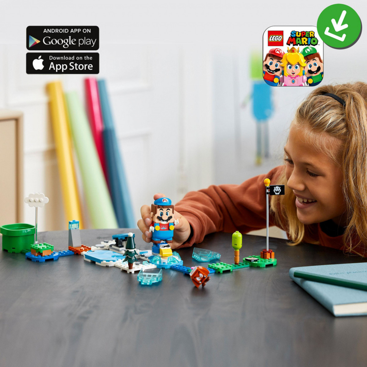 Il pack contiene una tuta di ghiaccio da far indossare a LEGO Mario (personaggio non incluso) e i personaggi di un Pinguastro e di un Goomba LEGO. La tuta di Super Mario di ghiaccio gli permette di reagire in tanti divertenti modi: ad esempio, una palla di neve appare sullo schermo della sua pancia, dandogli un potere extra per sconfiggere i nemici. La piattaforma di ghiaccio blu costruibile attiva i suoni di pattinaggio di LEGO Mario quando ci pattina sopra. C’è anche una pedana su cui poter saltare con Mario per lanciare il Pinguastro contro un blocco di ghiaccio in mattoncini LEGO: quando il blocco di ghiaccio si rompe, viene rivelato il Goomba. (Nota: per giocare è necessario uno degli Starter Pack 71360, 71387 o 71403). Una bellissima idea regalo che consente ai bambini e alle bambine di partecipare a una nuova e fantastica tendenza. Un playset LEGO da collezione ideale per il gioco individuale oppure in compagnia.
