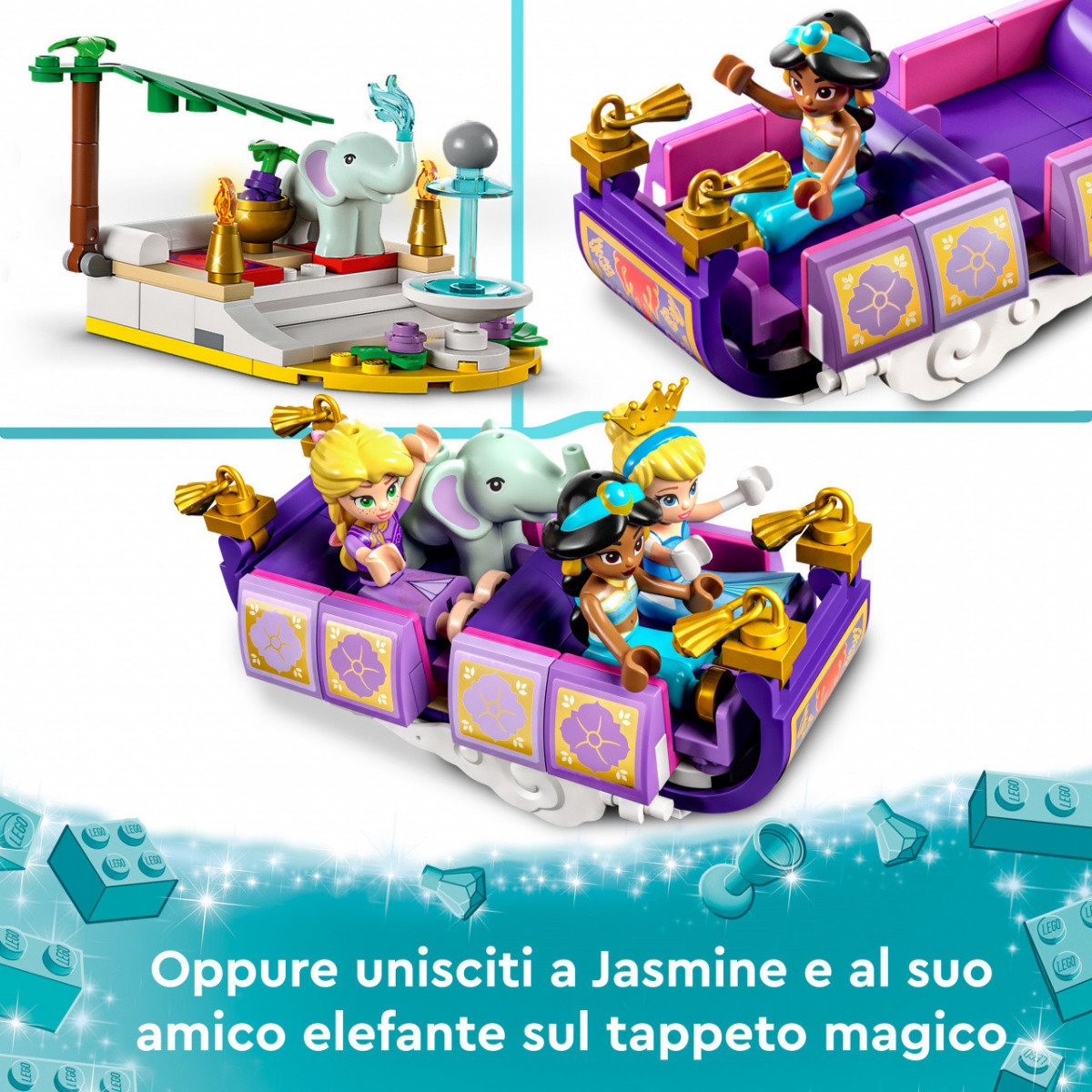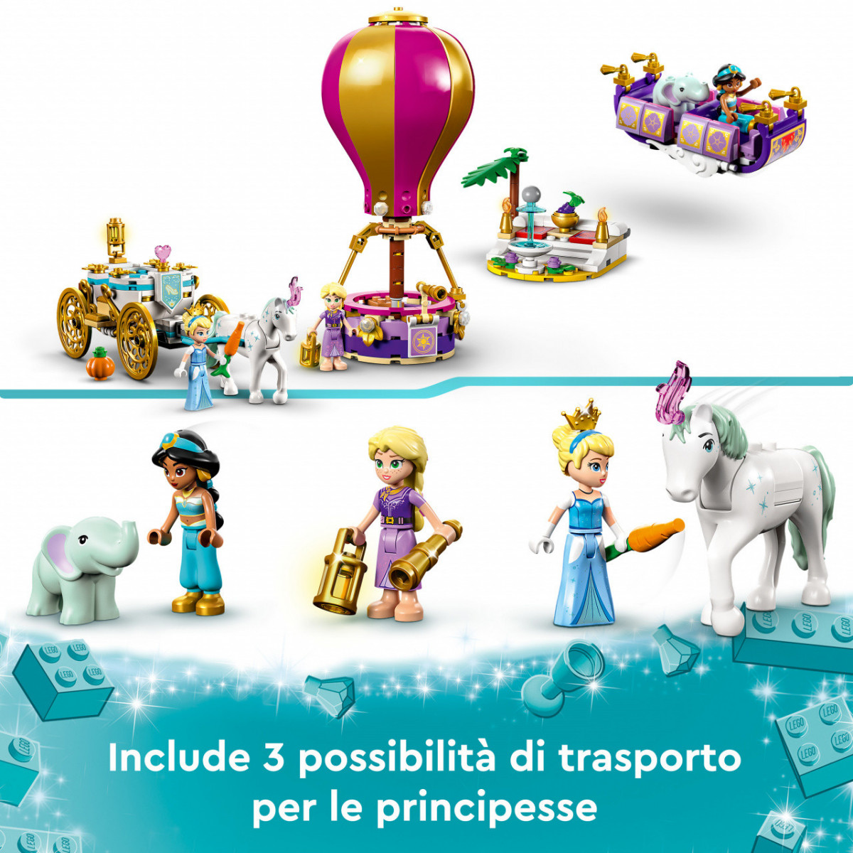 Questo set incoraggia il gioco con Cenerentola, Jasmine e Rapunzel ed è undivertente regalo che i fan di Disney di ogni età si divertiranno a costruire ed esplorare.