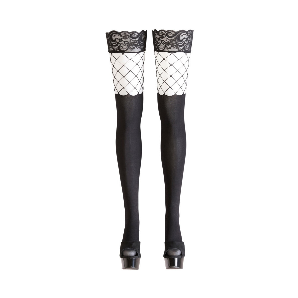 Calza non trasparente e a rete un uno! Senza reggicalze con rinforzo di silicone sulla balza per una tenuta antiscivolo. Nero, con balza di pizzo. 92% poliammide, 8% elastan.
