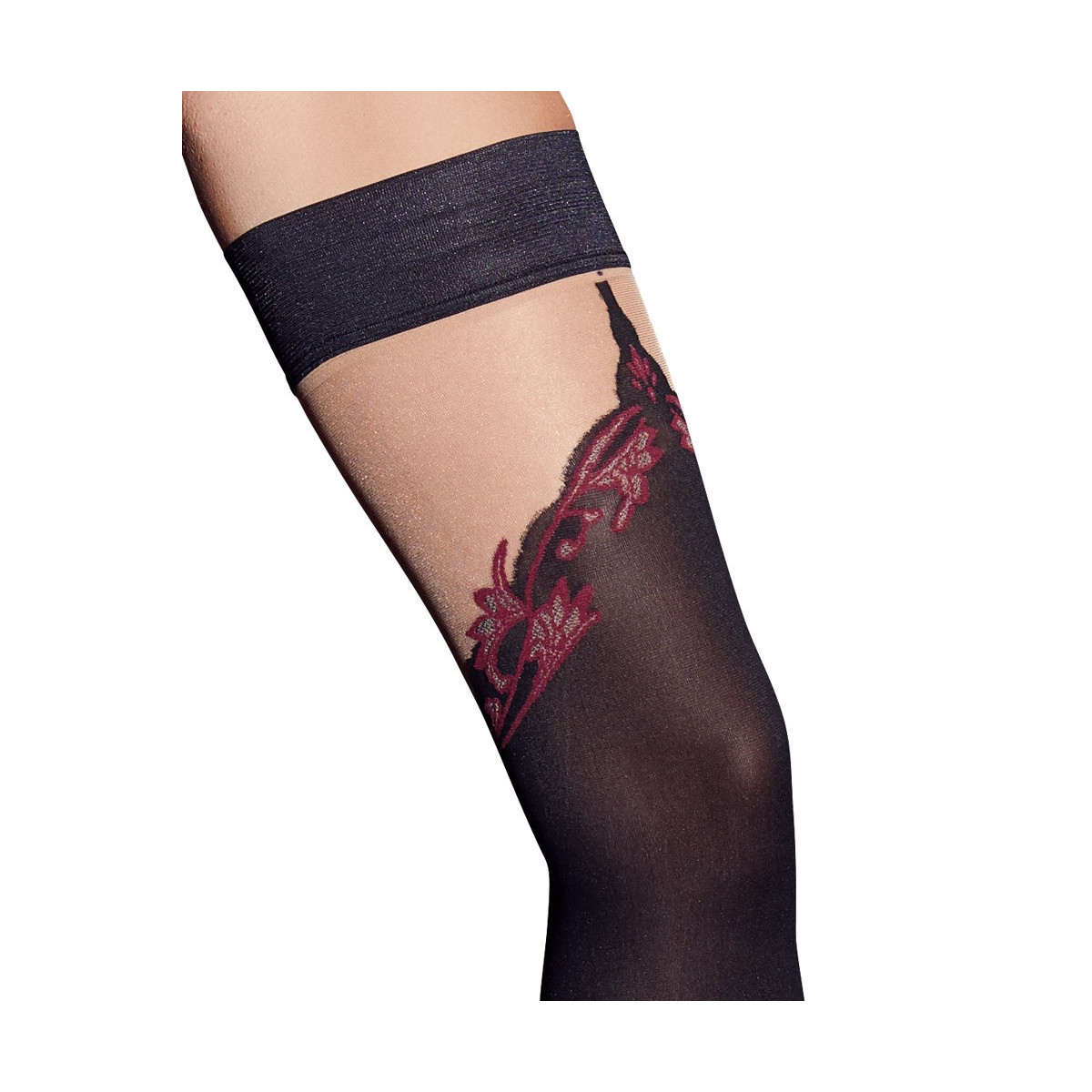 Calze a rete nere con parte superiore in pizzo di circa 12 cm di larghezza in nero/argento da agganciare a un reggicalze (non incluso). Sul retro con cucitura seducente.