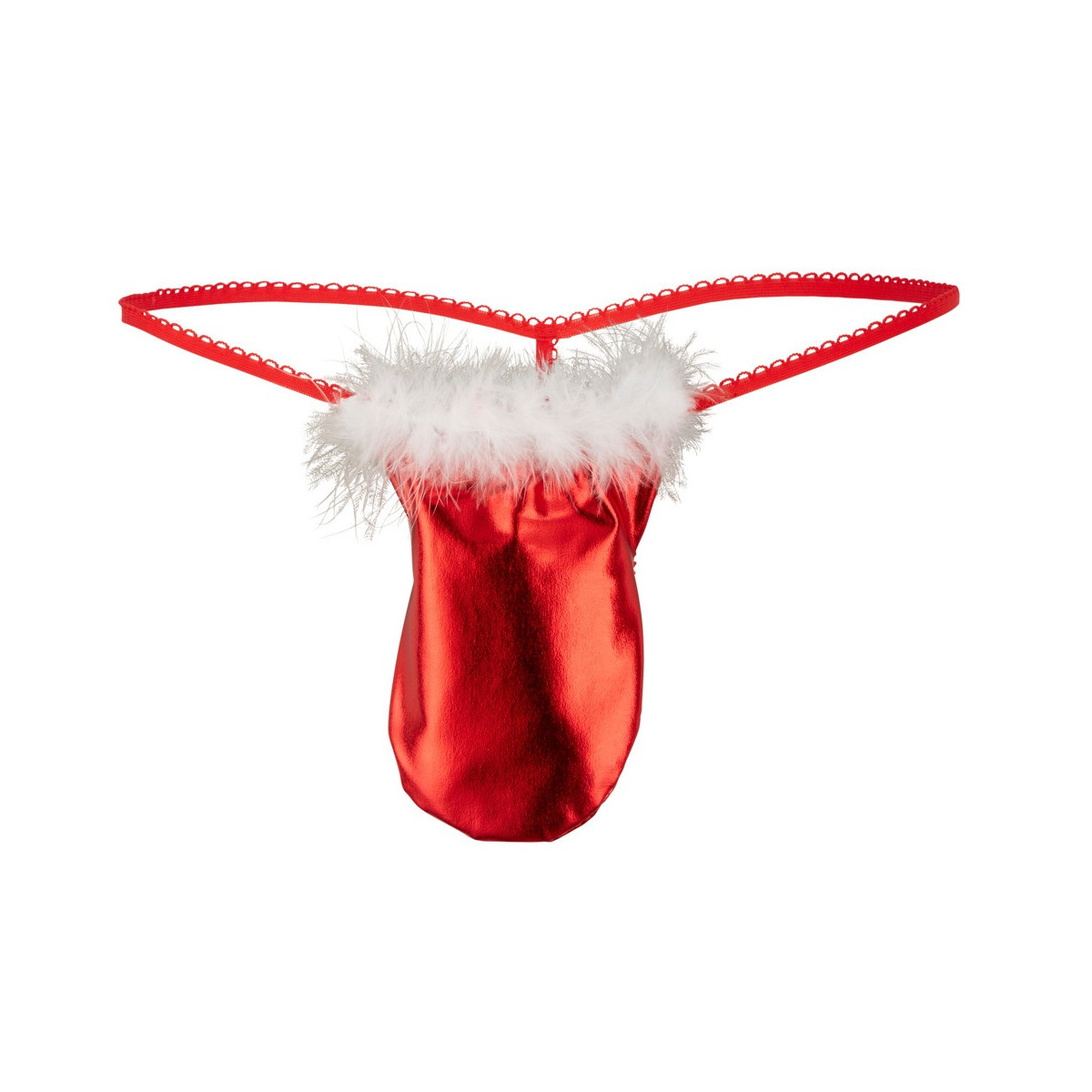 Perizoma rosso in look metallico con bordo di piume bianche in vita. Perfetto per il periodo natalizio.