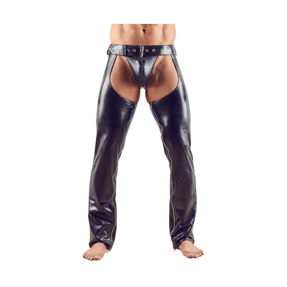 Duo forte: chaps neri con cerniera a due vie all'interno delle gambe e un perizoma caldo abbinato - entrambi fatti di similpelle leggermente elastica.