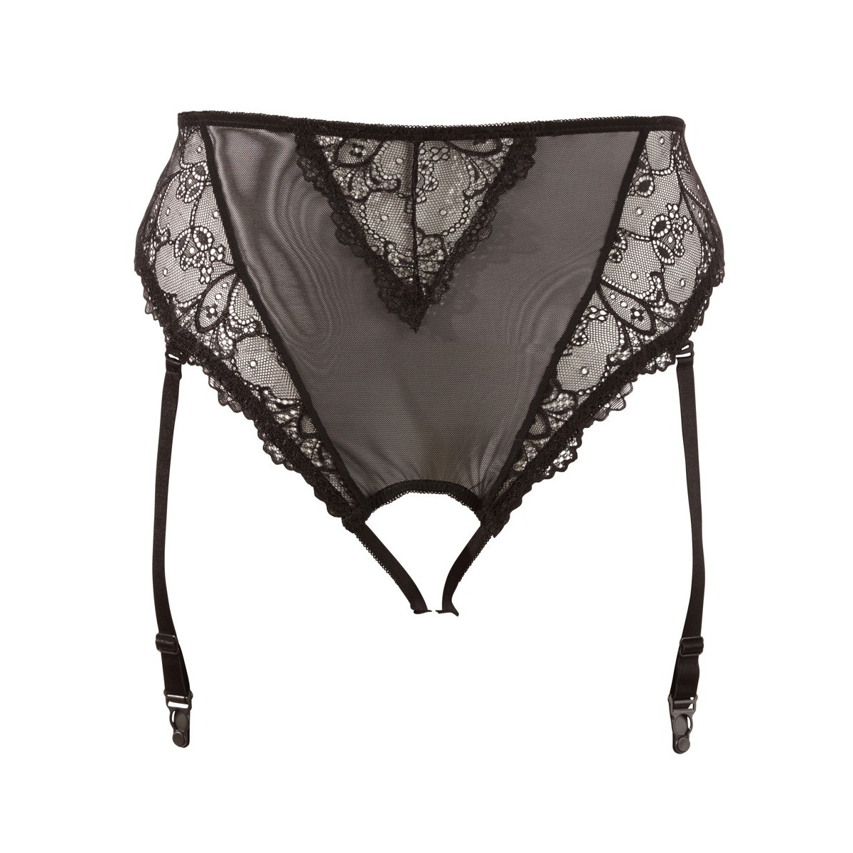 Mutandine con reggicalze Ouvert realizzate in powernet con pizzo floreale. Il taglio alto in vita lusinga la pancia e la vita. Bretelle regolabili e rimovibili. Senza calze.