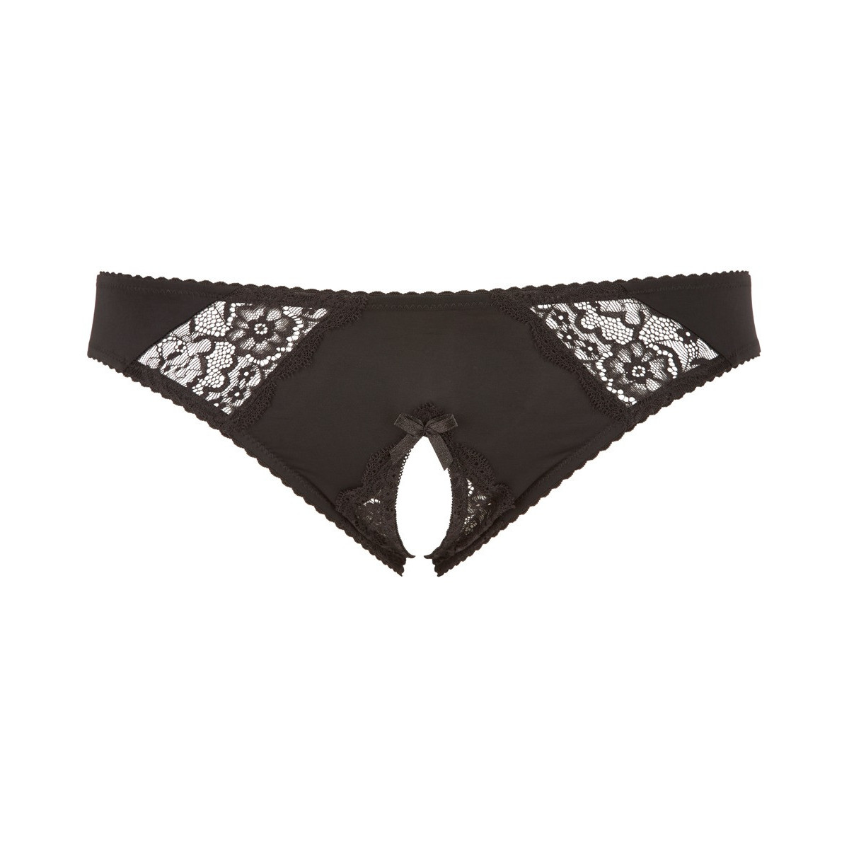 Slip aderente con inserti in pizzo elastico sul davanti. L'invitante cavallo aperto è accentuato da un fiocco decorativo sfacciato.