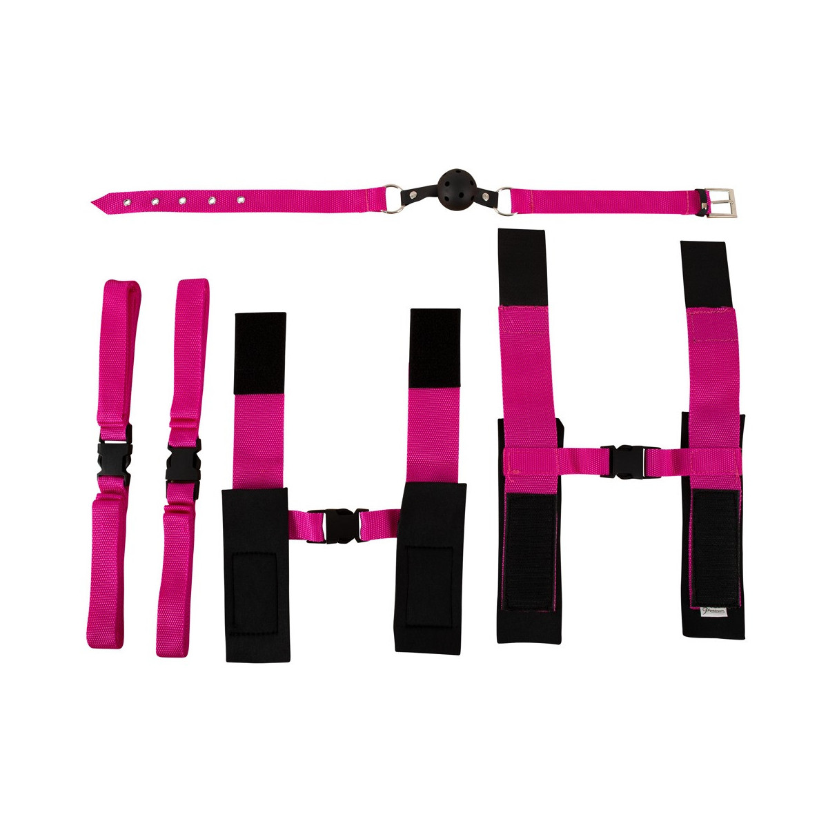 Con questo set di 10 pezzi, i principianti delle sessioni di bondage avranno i loro soldi. Il set comprende 2 manette, 2 manette alla caviglia, 4 legacci, 1 bavaglio alla bocca e 1 maschera per gli occhi. Le cinghie sono dotate di pratiche chiusure in velcro e sono regolabili per LUI e LEI. Le cinghie di costrizione possono essere attaccate alle cinghie dei polsi e delle caviglie per legare la parte sottomessa ad esempio alle colonne del letto. La stabile ball gag con fori di respirazione fornisce un silenzio sensuale e la maschera per gli occhi per eccitanti momenti ciechi.