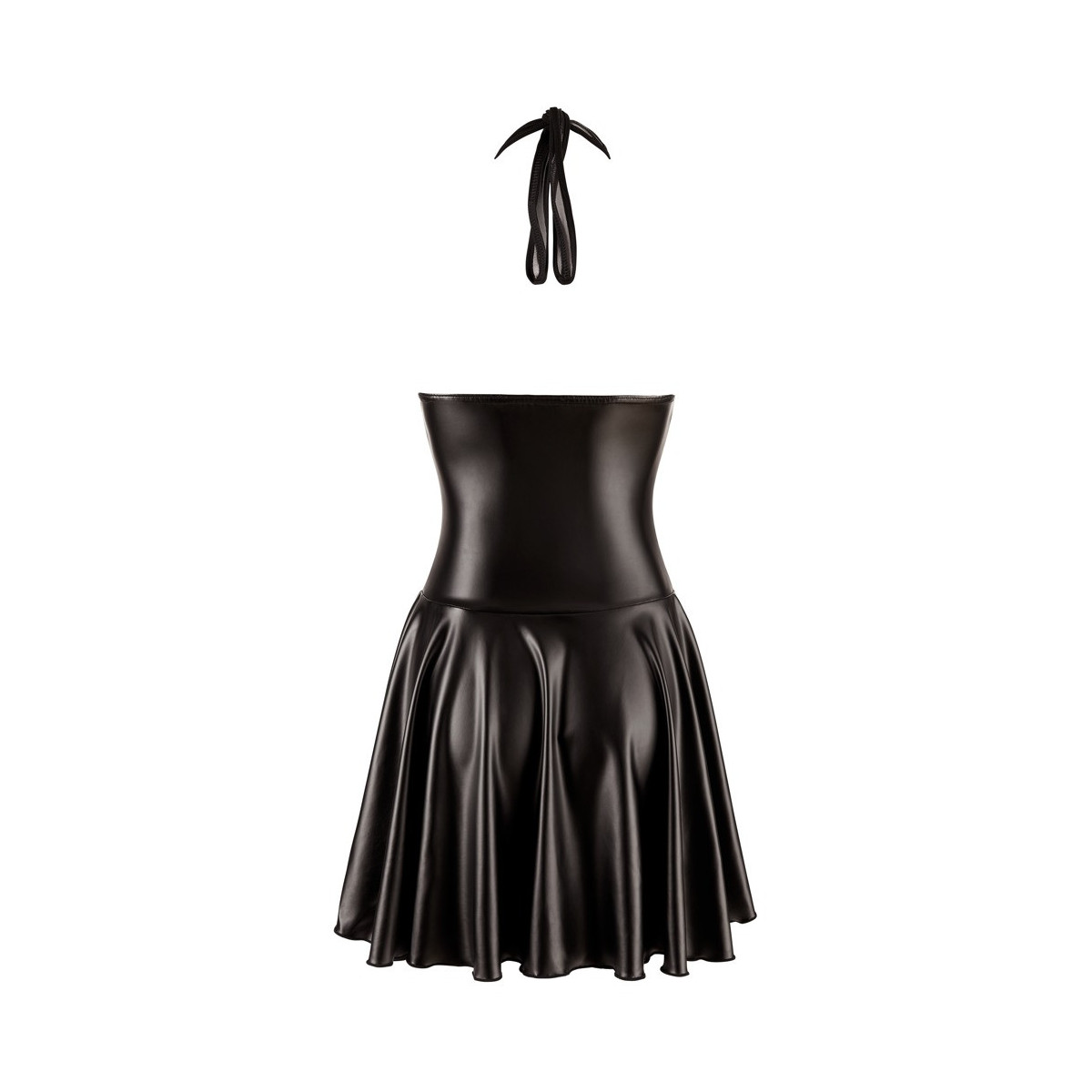 Abito corto di NOIR dal taglio aderente con gonna svasata. In nero nobile mix di powernet morbido con dettagli in vernice (parte superiore) e powerwetlook (parte della gonna). Fronte con zip a 2 vie su tutta la lunghezza dalla scollatura all'orlo. Senza schiena - il collo alto può essere legato. La gonna svasata è tagliata leggermente più corta davanti che dietro.