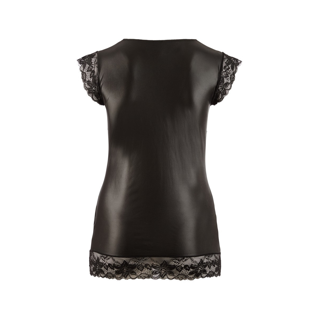 Quasi troppo bello da indossare solo in camera da letto è questo abito corto in wetlook nero. Con pizzo nero sul braccio, sull'orlo e sotto il busto come speciale eye-catcher.