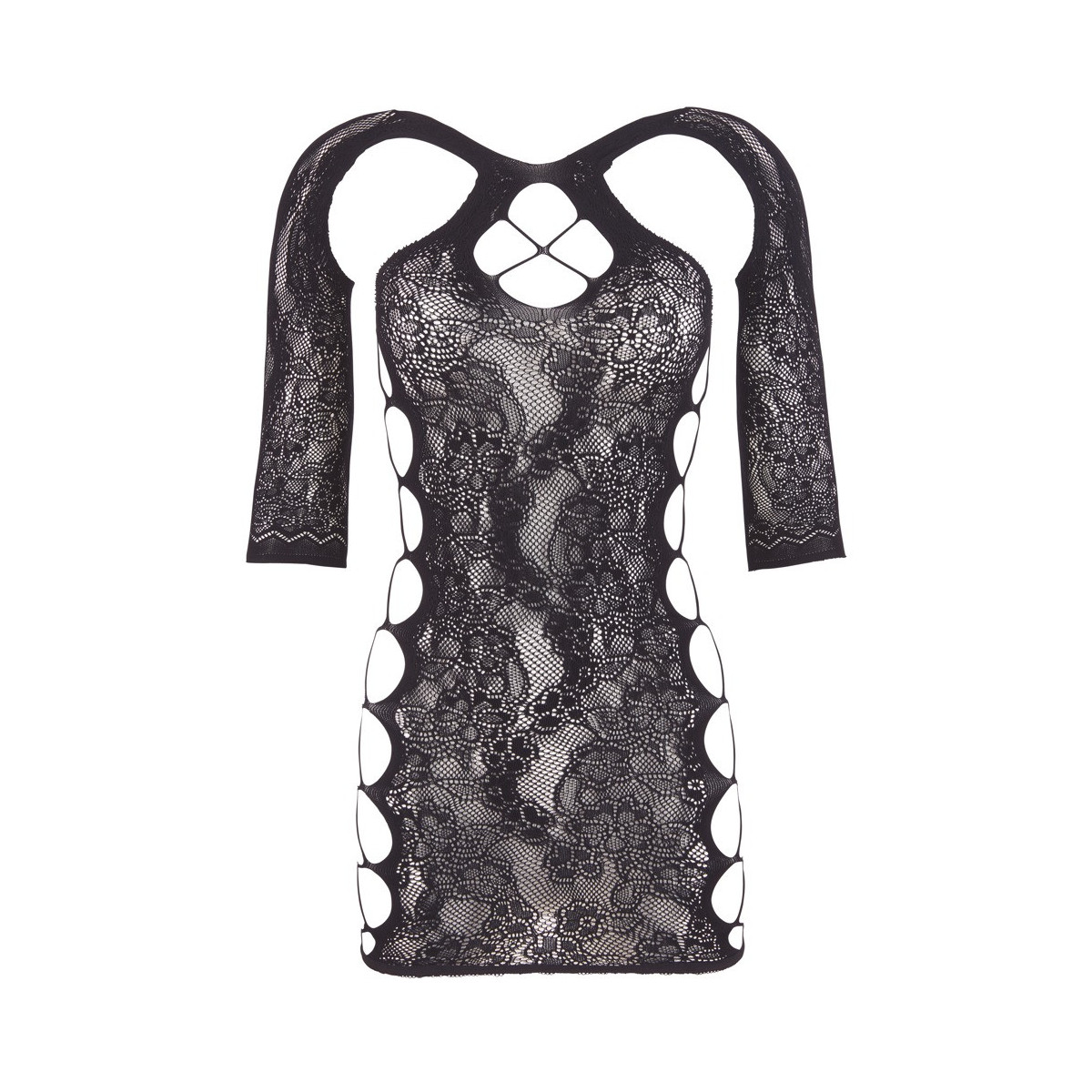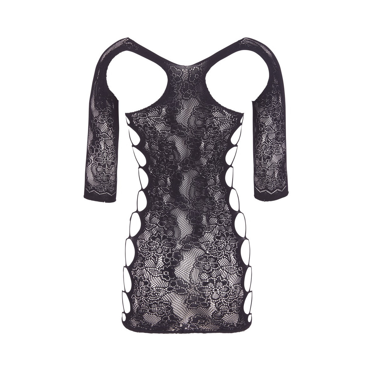 Il miniabito in simil-pizzo in tessuto elastico a rete è senza cuciture. Con mezze maniche e nastri incrociati nel décolleté e sui lati. Perizoma di pizzo incluso. Nero. 90% poliammide, 10% elastan.