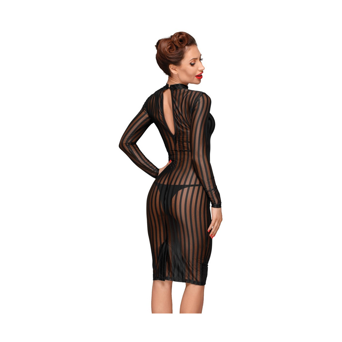 Abito midi aderente alla figura con maniche lunghe. Il delicato colletto a listino è dotato di un piccolo bottone sul collo. La vista posteriore delizia con una profonda scollatura. Realizzato in tessuto di tulle elasticizzato e molto morbido, accentuato da un emozionante look a righe semitrasparenti.