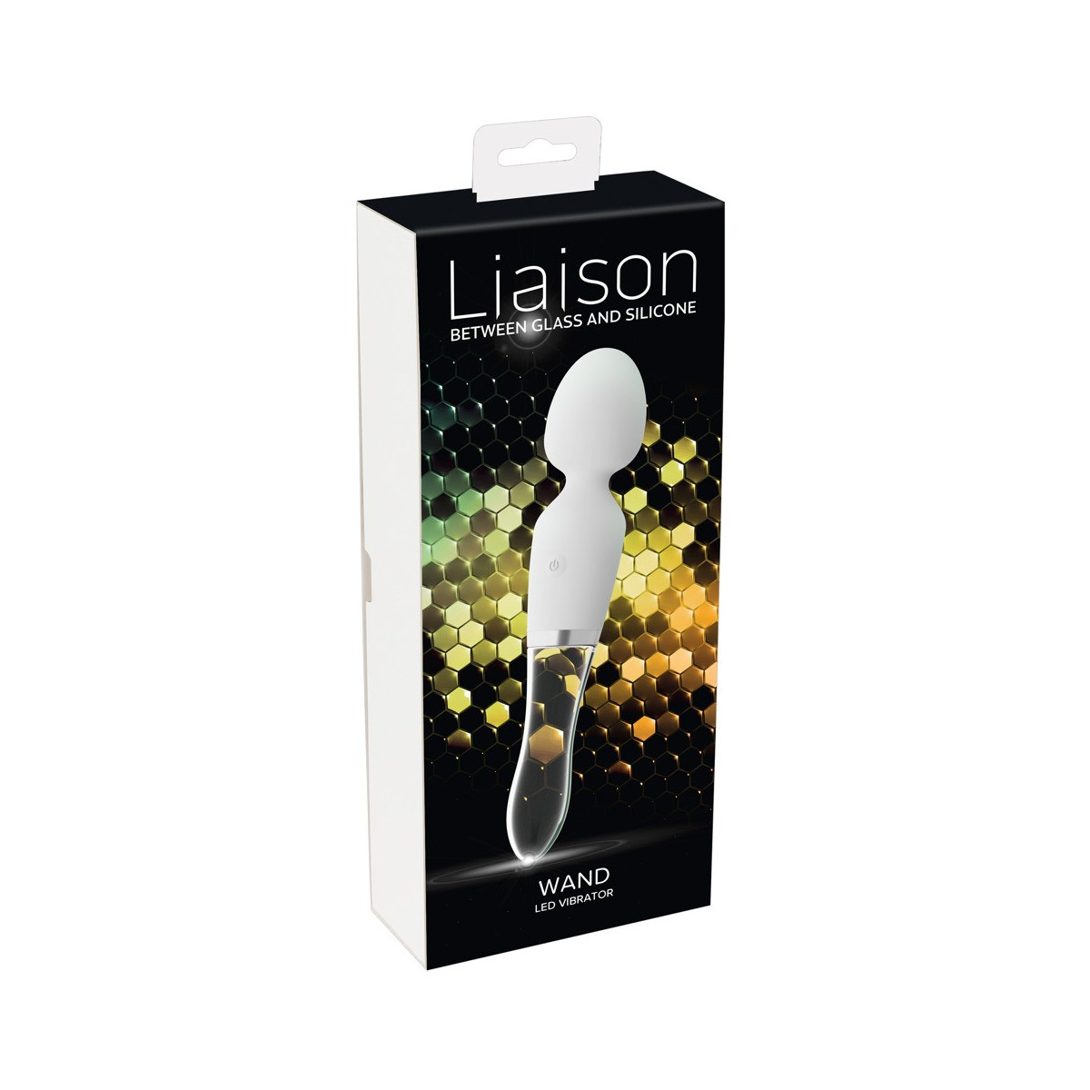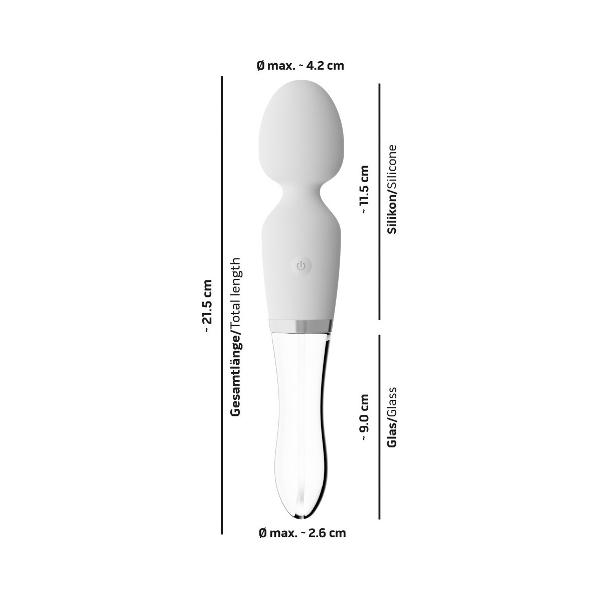 Elegante vibratore LED da parete di Liaison che combina tutti i vantaggi di un vibratore in silicone e vetro. Può essere utilizzato su entrambi i lati: Un lato massaggiatore con testa leggermente flessibile in silicone con texture morbida al tatto, l'altro vibratore in vetro borosilicato di qualità solida con sensuale illuminazione a LED nella punta.