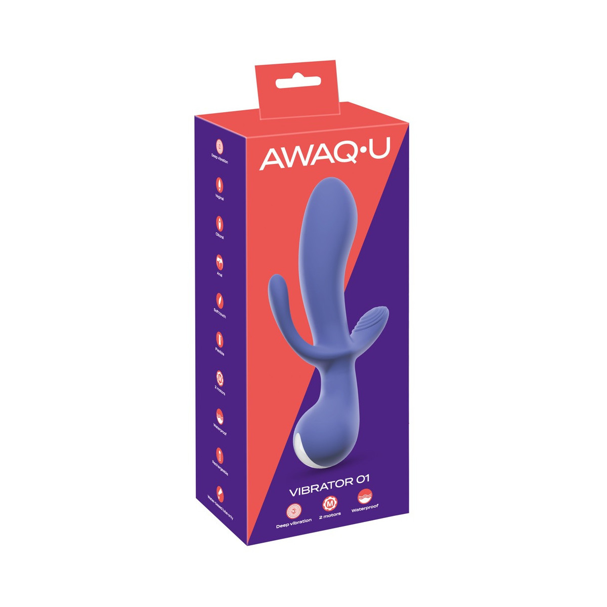 Elegante vibratore con stimolatore clitorideo e anale AWAQ.U Vibrator 1 di You2Toys in un elegante colore viola. Ben 2 potenti motori forniscono 10 modalità di vibrazione per l'asta e lo stimolatore clitorideo, che si diffondono fino alla stimolazione anale. Le potenti vibrazioni possono essere comodamente controllate direttamente sul toy premendo un pulsante: la vibrazione dell'asta con il pulsante On/Off, le vibrazioni dello stimolatore clitorideo con i due pulsanti +/-. Anche dentro/sotto l'acqua, perché questo coccolatore tuttofare è impermeabile.