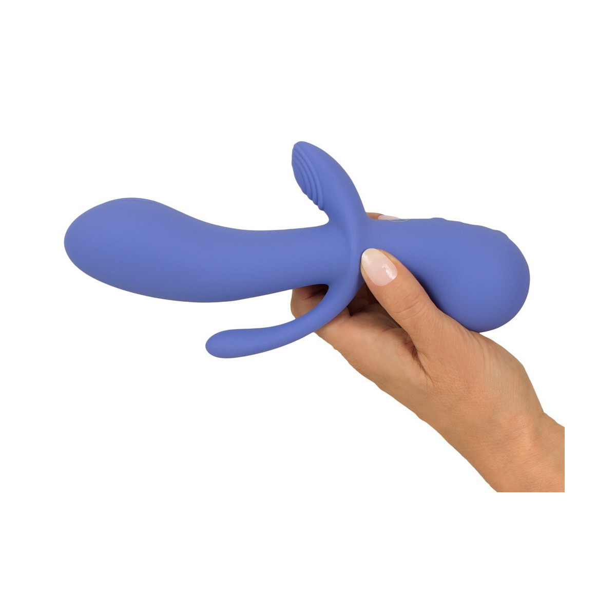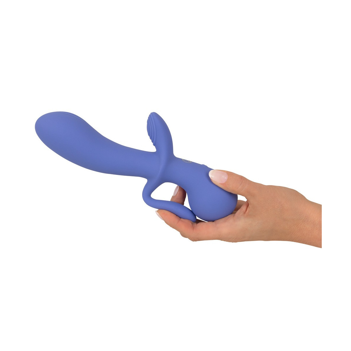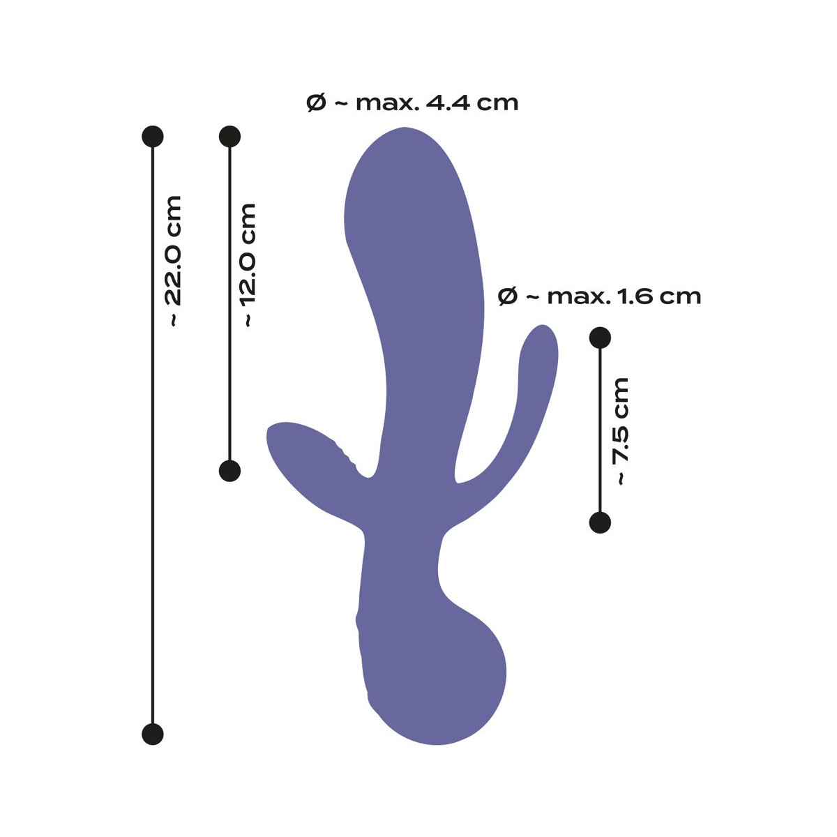 Realizzato in silicone e rivestito di una texture morbida al tatto, il vibratore è facile da inserire e scivola come se fosse da solo. Con il suo fusto idealmente curvo, lo stimolatore del clitoride a coste e lo stretto stimolatore anale flessibile, si adatta perfettamente all'anatomia e ai movimenti del corpo.