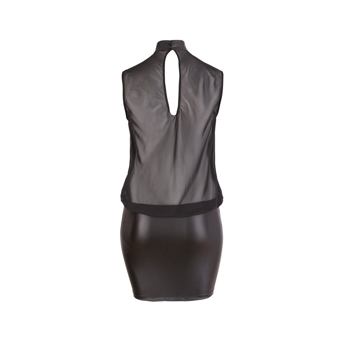 Questo mini abito nero è a cuore aperto e rivelatore allo stesso tempo, perché il top senza maniche in tessuto trasparente è tagliato molto largo e largo e lusinga le tue curve. Solo nella parte posteriore mostra la pelle nuda grazie alla scollatura. Al collo, un piccolo colletto rialzato con due bottoni arrotonda l'abito verso l'alto. La gonna opaca, lucida e coprente, invece, è aderente e quindi il contrasto perfetto con il top. Se non è una combinazione di successo!