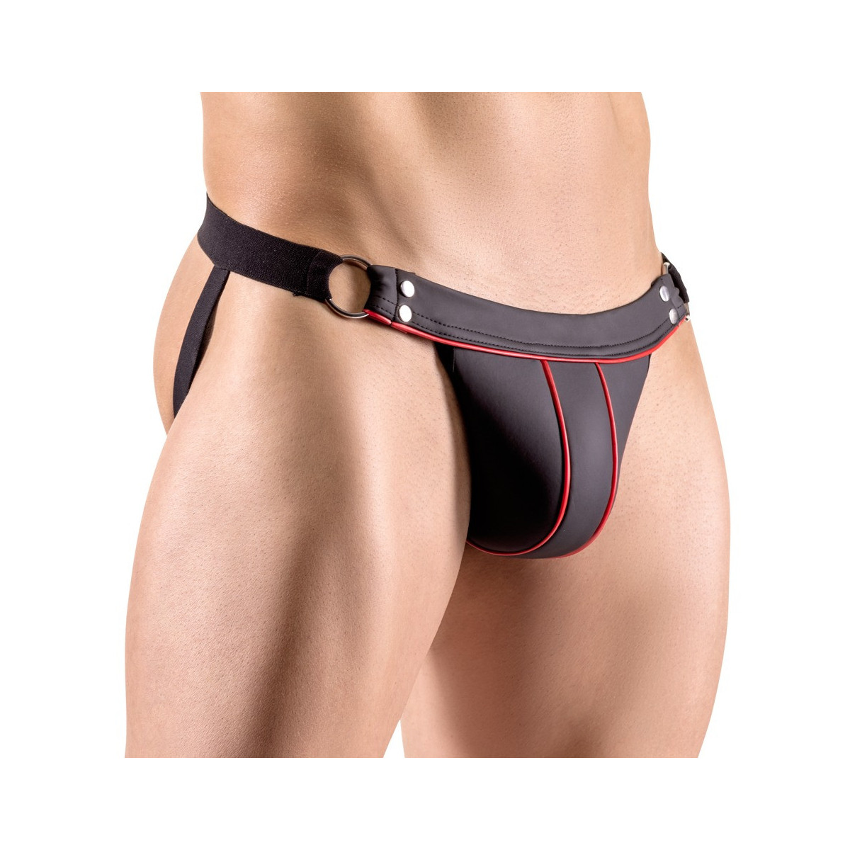 Eccitante perizoma senza culo di Svenjoyment in un look nero opaco alla moda che ricorda visivamente il neoprene. Nella parte anteriore con bordatura in rosso a contrasto come un eye-catcher. Splendidamente morbido ed elastico con larghe cinghie intrecciate per una perfetta vestibilità confortevole.