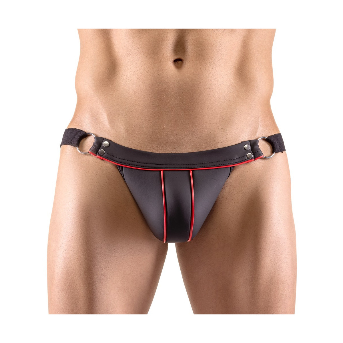 Eccitante perizoma senza culo di Svenjoyment in un look nero opaco alla moda che ricorda visivamente il neoprene. Nella parte anteriore con bordatura in rosso a contrasto come un eye-catcher. Splendidamente morbido ed elastico con larghe cinghie intrecciate per una perfetta vestibilità confortevole.