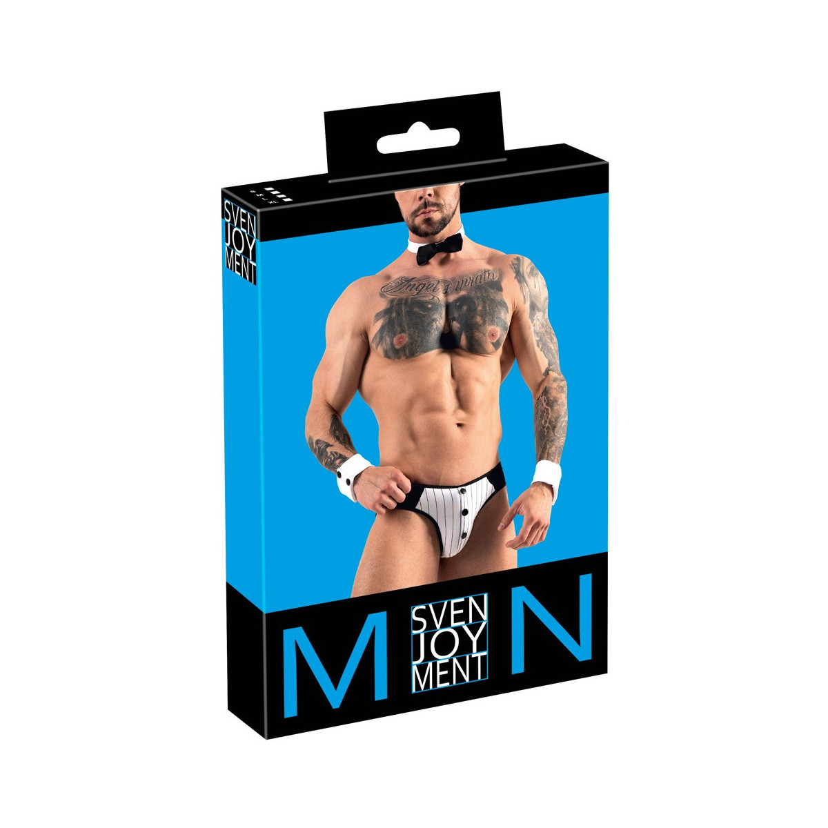 Set di Svenjoyment composto da slip, 2 polsini e papillon. Jockslip davanti con inserto gessato ordinato con bottoni deco, eccitante senza culo!