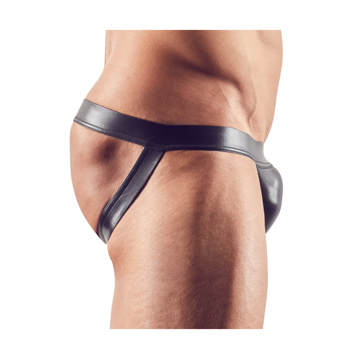 Jock elastico in nero lucido. Elastico della cintura e cinghie del sospensorio coperte.