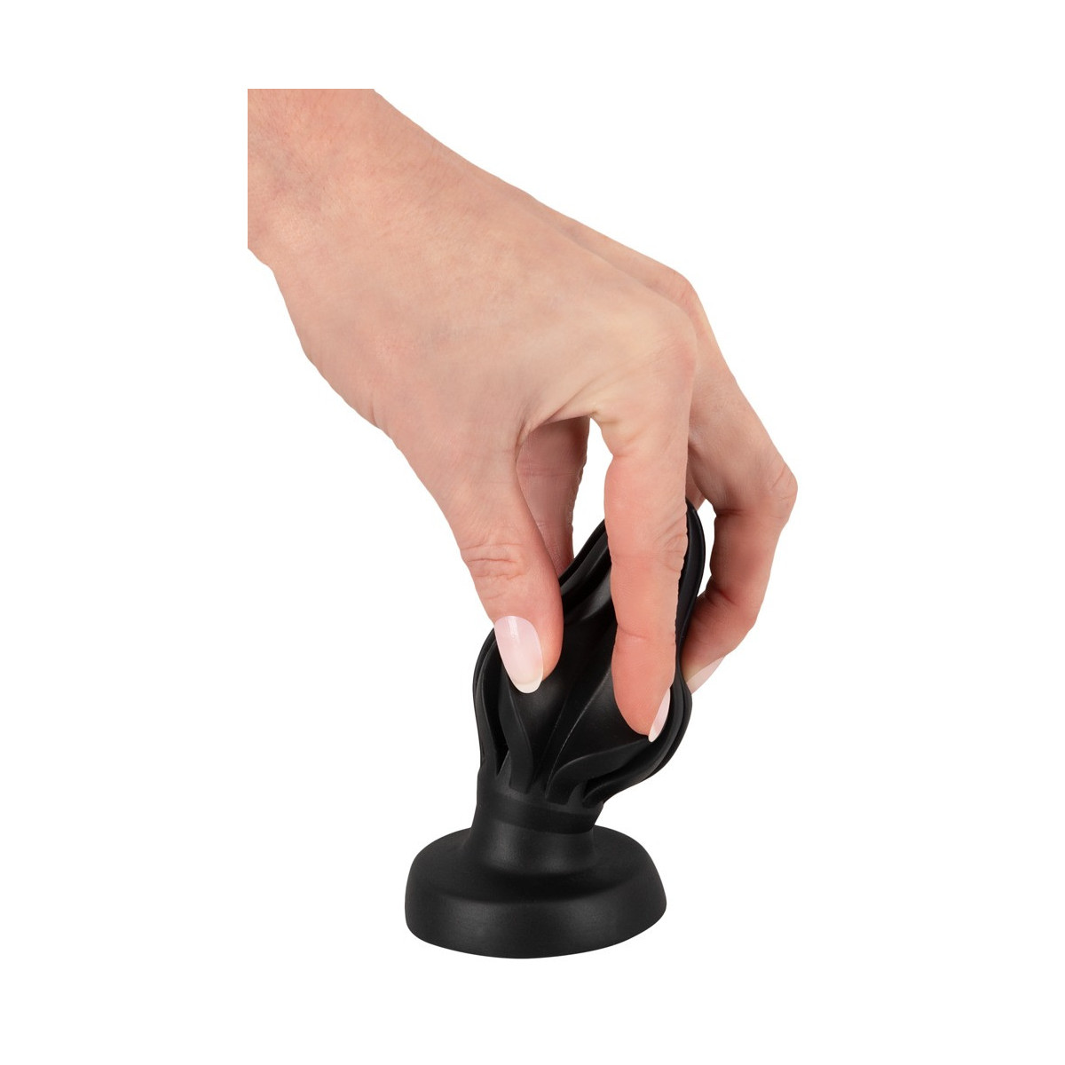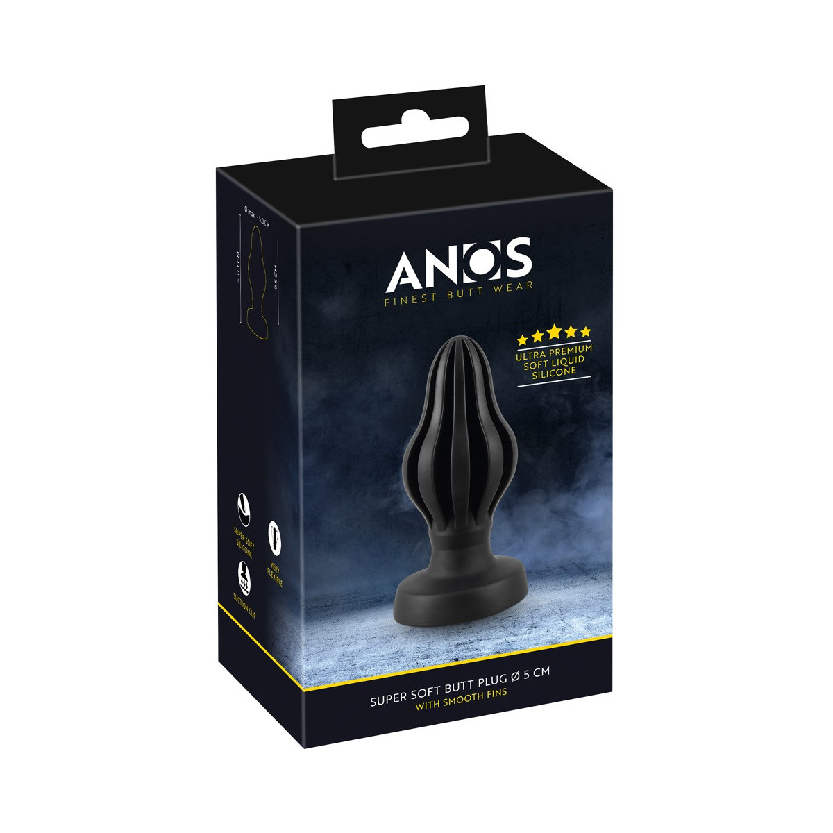 Super Soft Butt Plug Ø 5 di ANOS dal design conico con scanalature di stimolazione pronunciate. La grande base di aspirazione assicura una manipolazione sicura senza scivolare - si attacca anche a tutte le superfici lisce e permette l'uso a mani libere.