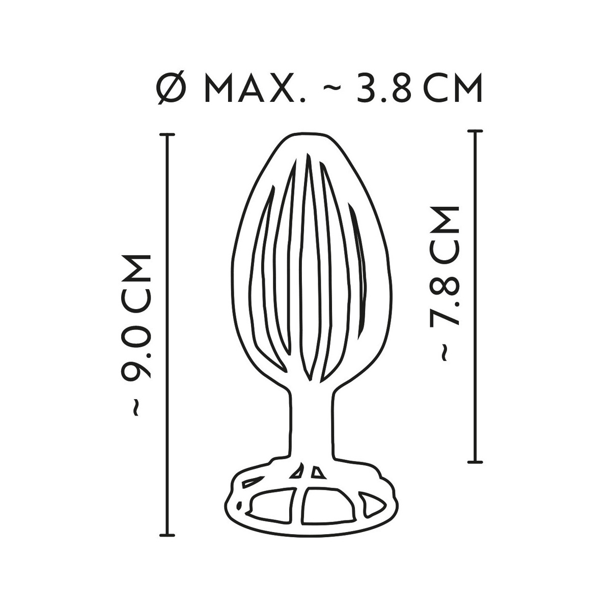 Lunghezza totale 9 cm, lunghezza di inserimento 7,8 cm, Ø 3,8 cm. Peso 52 g.