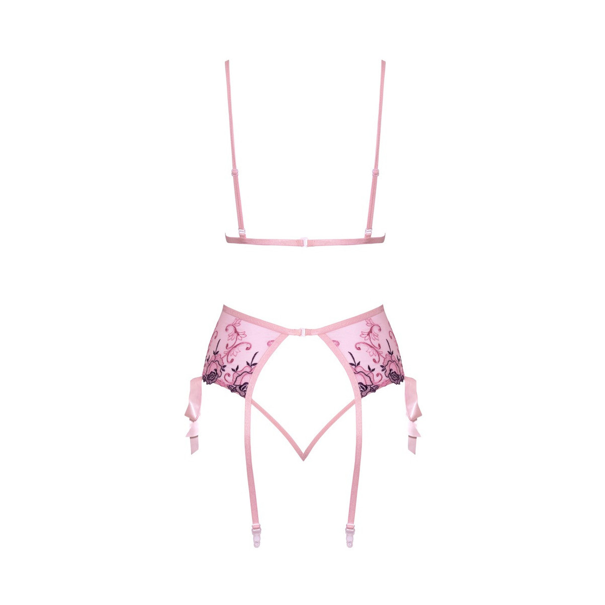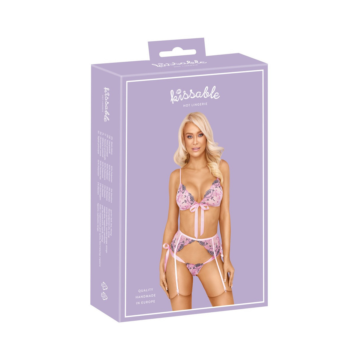 Kissable BH Set - Completino Intimo Rosa con Ricami Floreali, Reggiseno + Perizoma + Reggicalze, Taglia L-XL