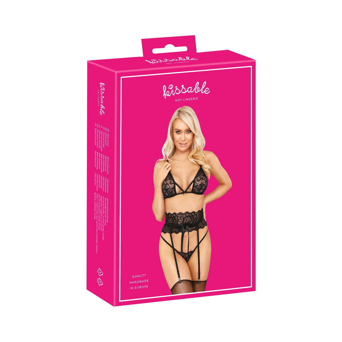 Reggiseno morbido, reggicalze e perizoma in un elegante set di kissable realizzato interamente in pregiato pizzo nero. Morbido ed elastico su tutto il perimetro per il massimo comfort. Reggiseno elegante con chiusura a gancetto sulla schiena e spalline regolabili abbinate. Il reggicalze, che aumenta la vita, è caratterizzato da nastri di raso che si annodano in un fiocco sul davanti. L'allacciatura a gancio sul retro attraversa l'intera larghezza, mentre le bretelle sono regolabili. Il piccolo perizoma seduce con le sue due strette fasce elastiche che si uniscono all'inguine.