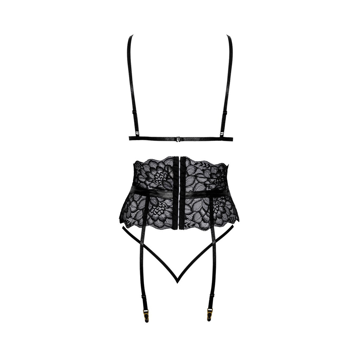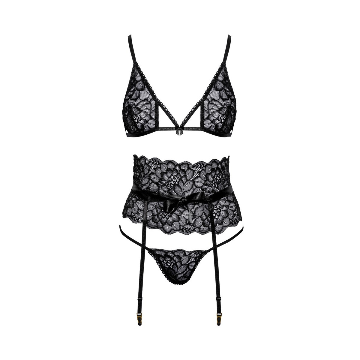 Kissable Elegant Set - Completino Intimo in Pizzo Nero, Reggiseno + Perizoma + Reggicalze, Taglia S-M
