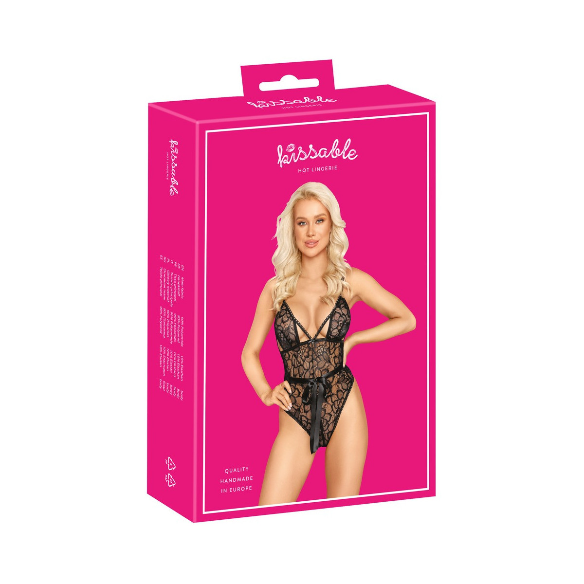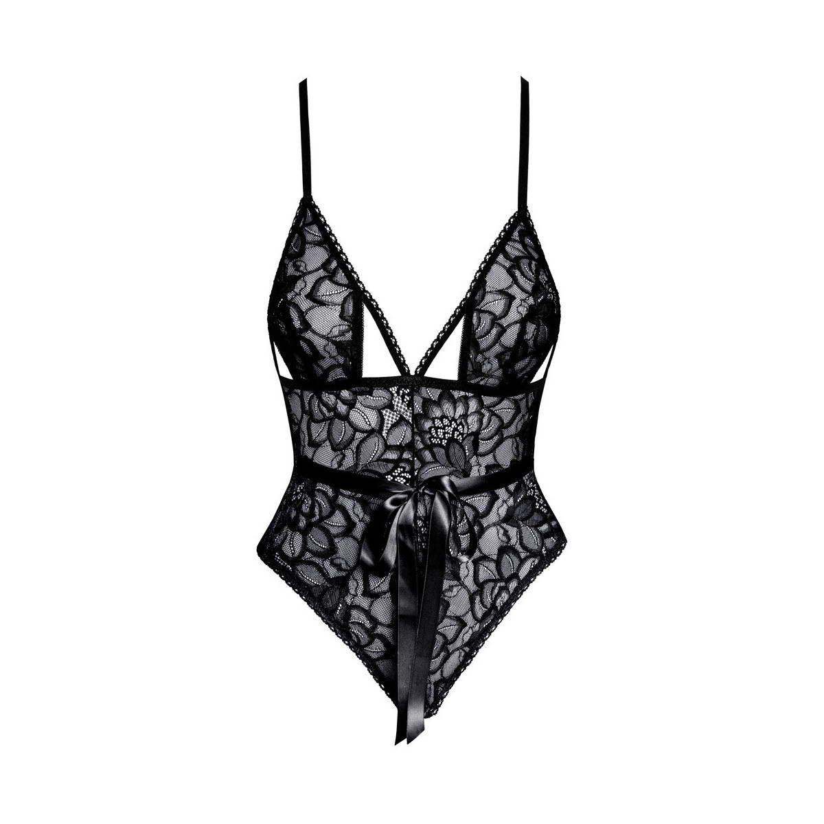 Elegante body di kissable completamente realizzato in pregiato pizzo nero. Morbido ed elastico su tutto il perimetro per il massimo comfort. Stile seducente con coppe morbide e fasce elastiche per il décolleté, oltre a un fiocco in raso sul davanti che esalta la vita. Taglio extra alto per mettere in risalto il fondo e le gambe. Chiusura con gancio sul retro. Le cinghie sono regolabili.