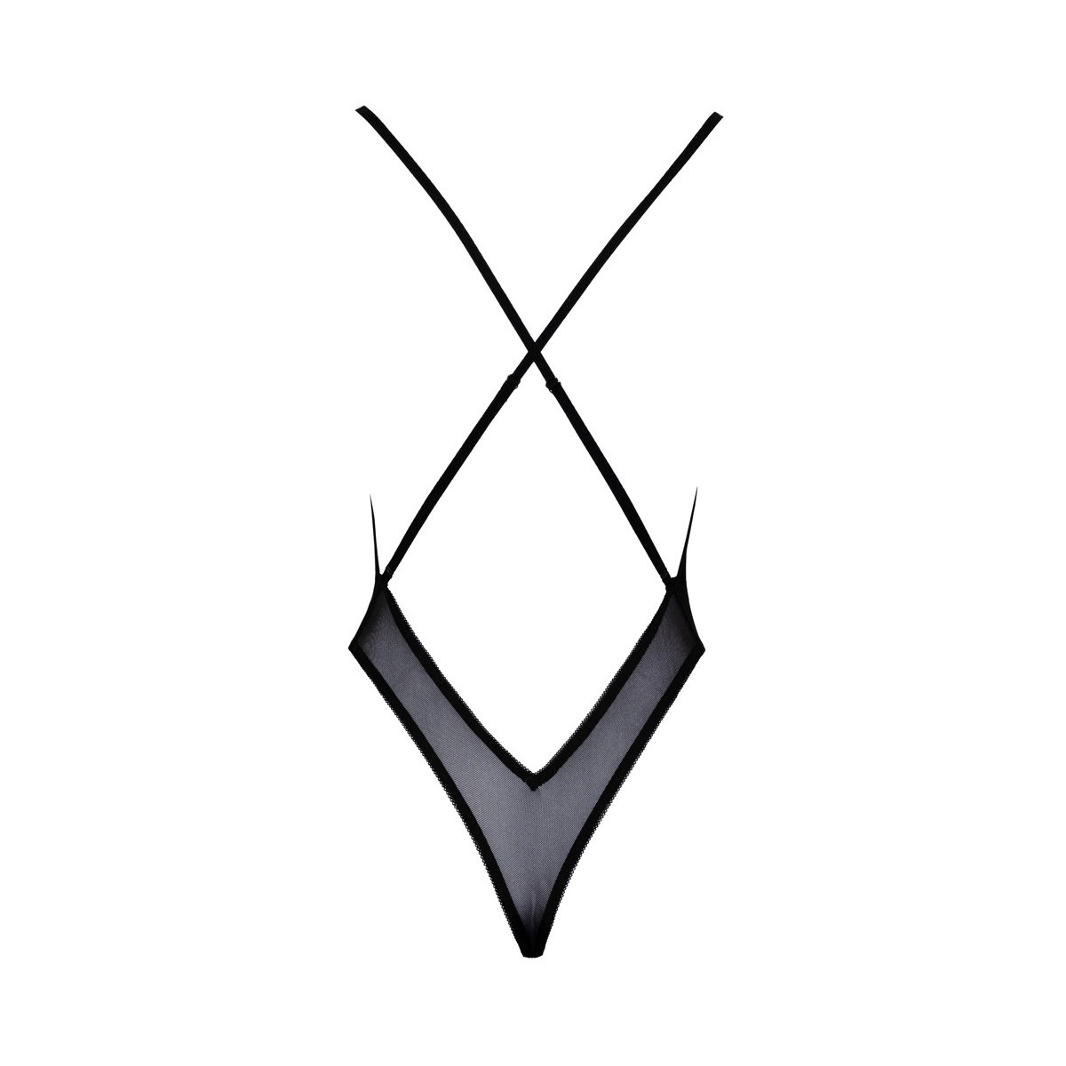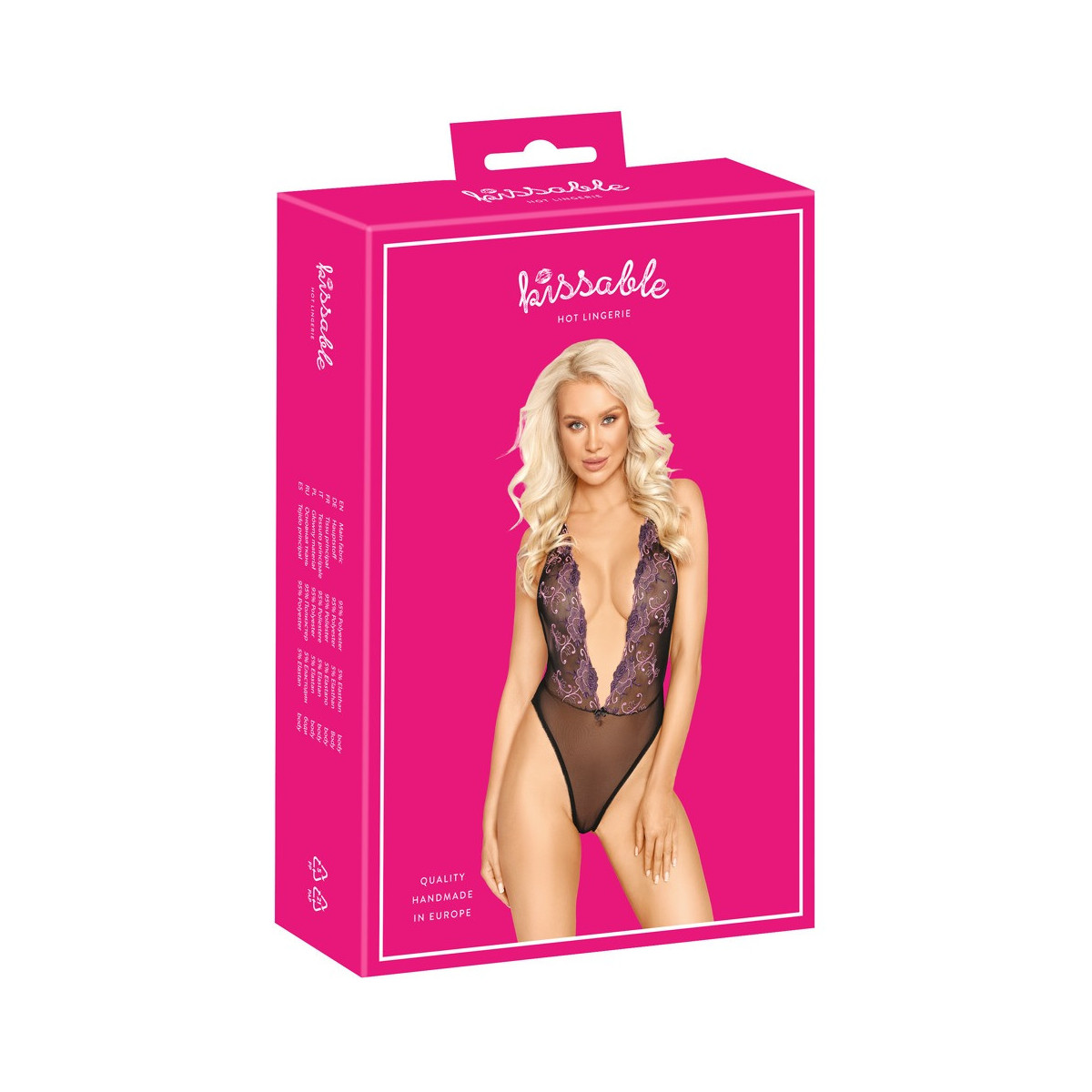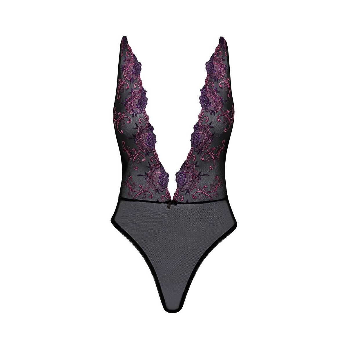 Body extra scollato di kissable realizzato in pregiato powernet nero con intricati ricami floreali in rosé e viola. Morbido ed elastico su tutto il perimetro per il massimo comfort. Le spalline regolabili si incrociano sulla schiena.