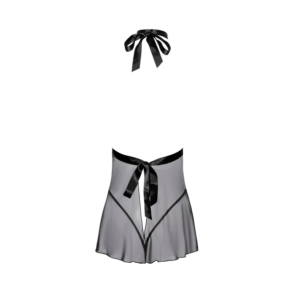 Babydoll corto e svasato di kissable in trasparenza nera, realizzato in splendido pizzo (top) e fine powernet (gonna). Morbido come la seta ed elastico per un elevato comfort di utilizzo. Sul davanti con una generosa scollatura fino alla vita, senza schiena. La fascia in raso si annoda al collo, la cintura in raso alla schiena. Il perizoma piccolo coordinato è incluso.