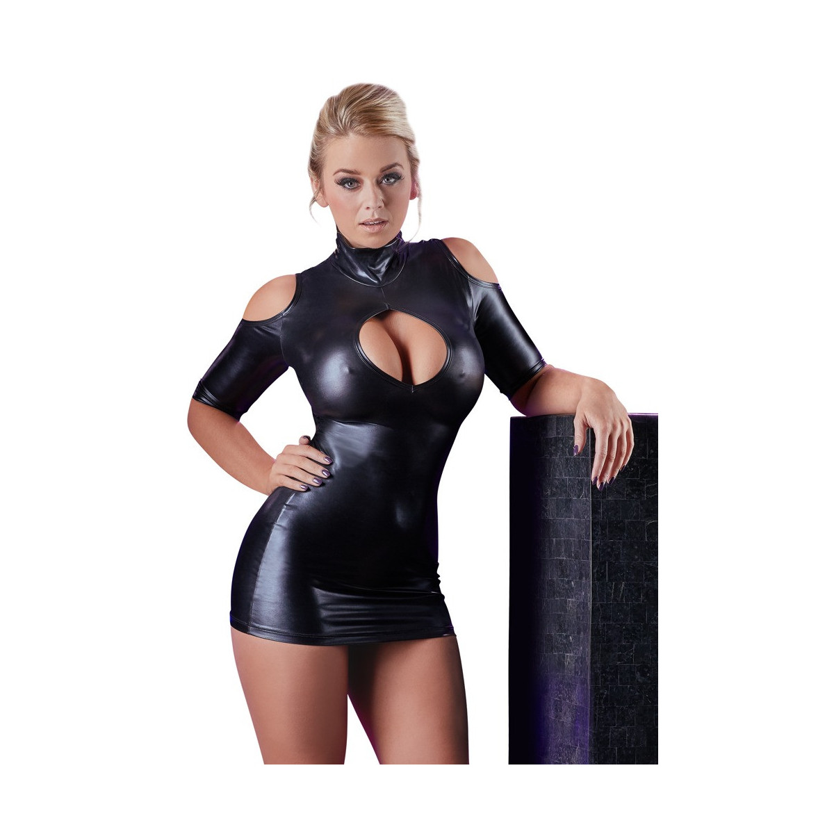 Questo mini abito nero con colletto rialzato e maniche corte colpisce per le sue spalle nude e la scollatura raffinata. Il materiale lucido opaco wet look aderisce bene e mette in mostra le curve femminili in modo formoso e seducente.
