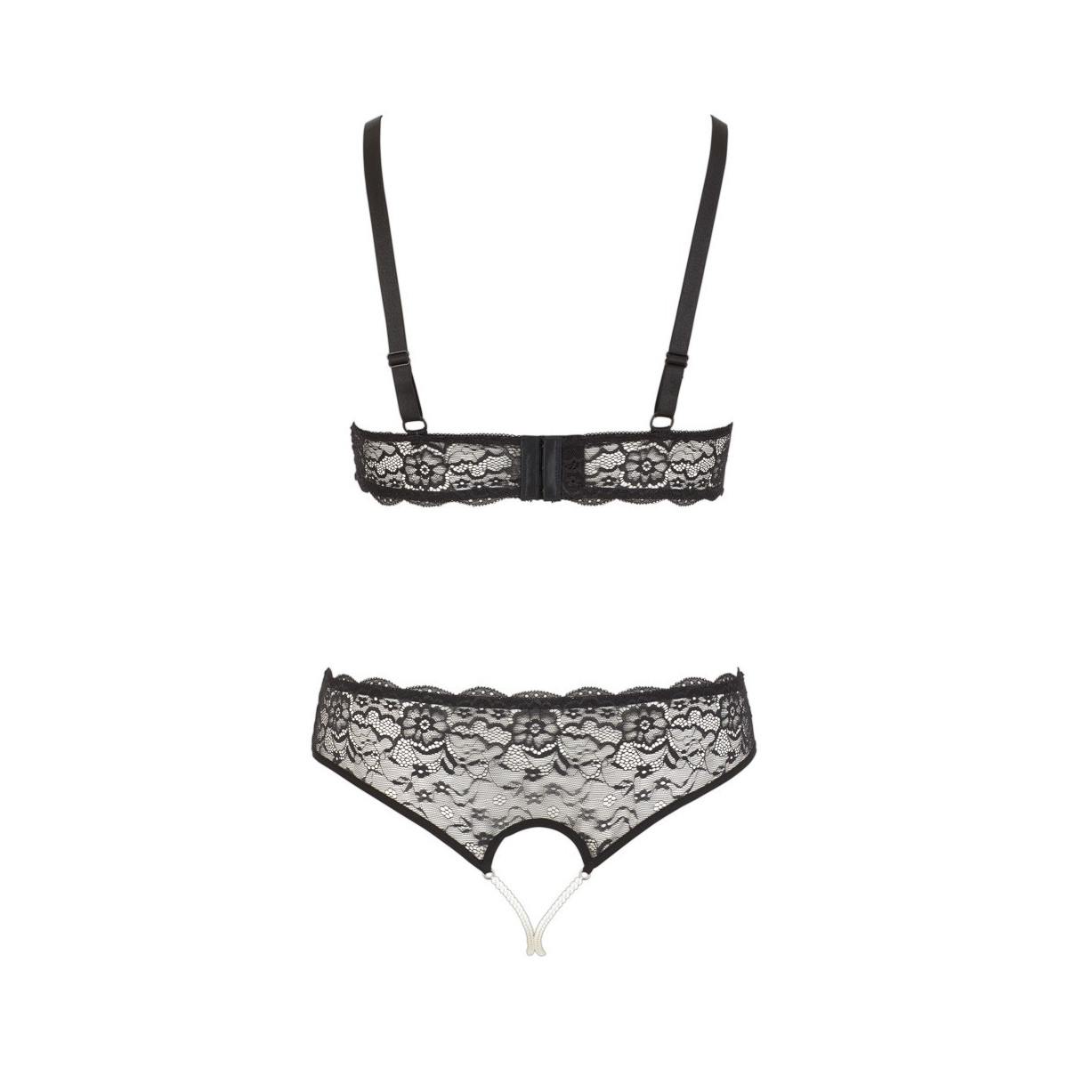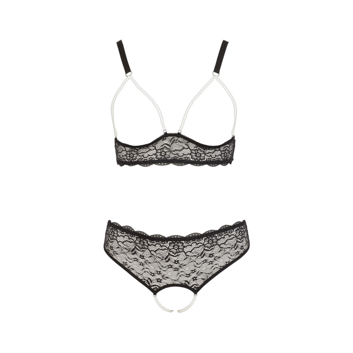 Il reggiseno morbido con chiusura a gancio sulla schiena e spalline regolabili impressiona con le coppe aperte e le catene di perle sopra il seno, mentre 2 catene di perle attraversano il cavallo completamente aperto del perizoma.