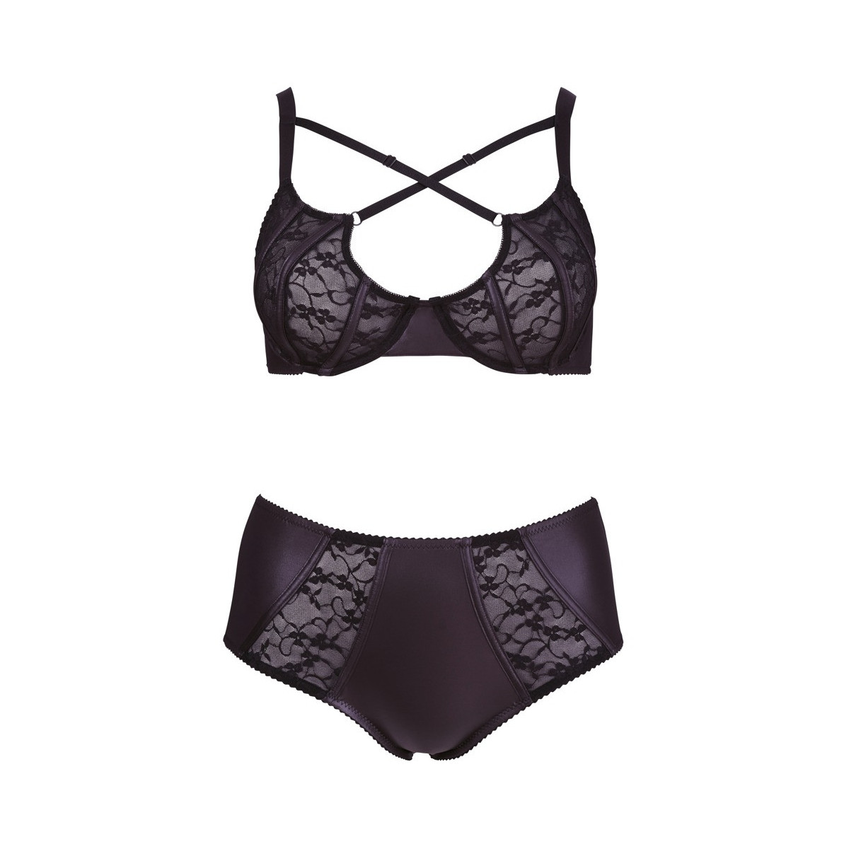 Reggiseno con ferretto e mutandine in nero elegante. Reggiseno con ferretto in stile sofisticato con coppe in pizzo e spalline incrociate regolabili sopra la scollatura. Le staffe sui lati e le cinghie regolabili garantiscono una perfetta e confortevole vestibilità. Gli slip segnano punti con linee sottili e inserti in pizzo sul davanti e sui lati. 90% poliestere, 10% elastan; pizzo 90% poliammide, 10% elastan.
