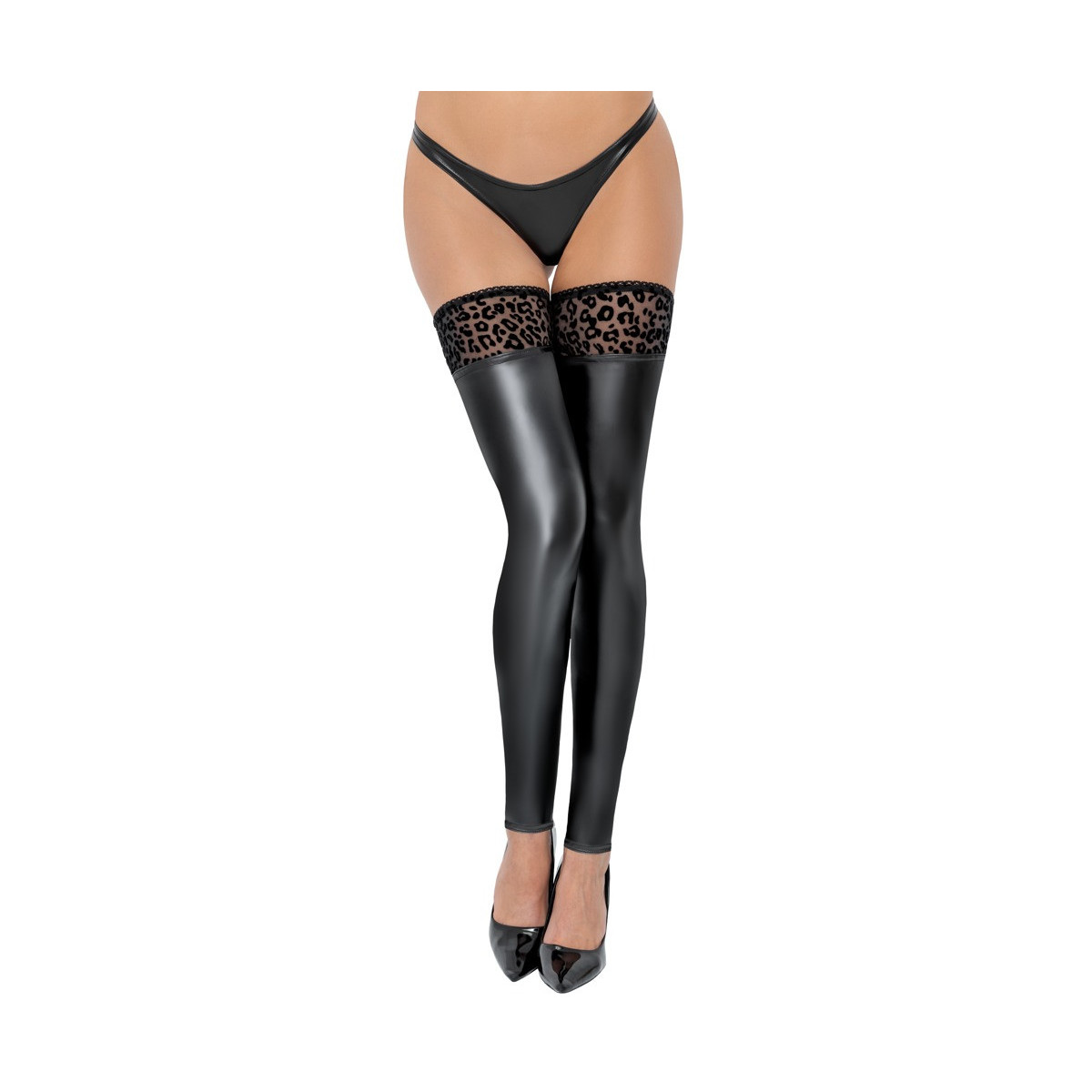 Stravaganza esclusiva per la gamba! Overknees (scaldamuscoli) senza piede di Noir in un nobile wetlook opaco e lucido. Polsini antiscivolo in delicata trasparenza con stampa flock in velluto leo. Morbido ed elastico su tutto il perimetro per un elevato comfort di utilizzo. 76% poliestere, 24% elastan, rivestimento in polimero.