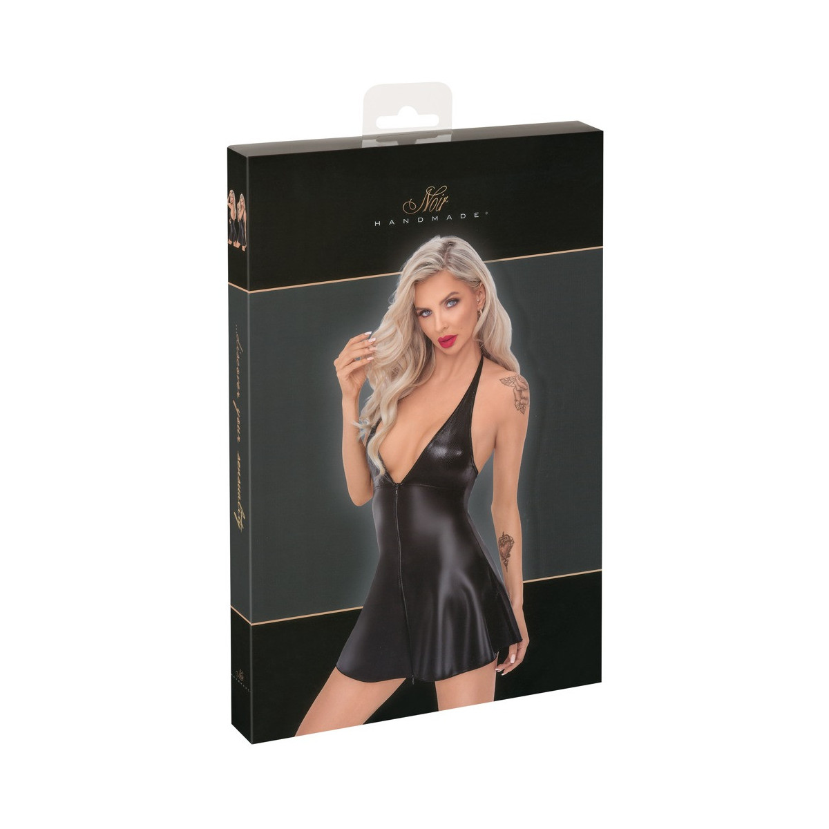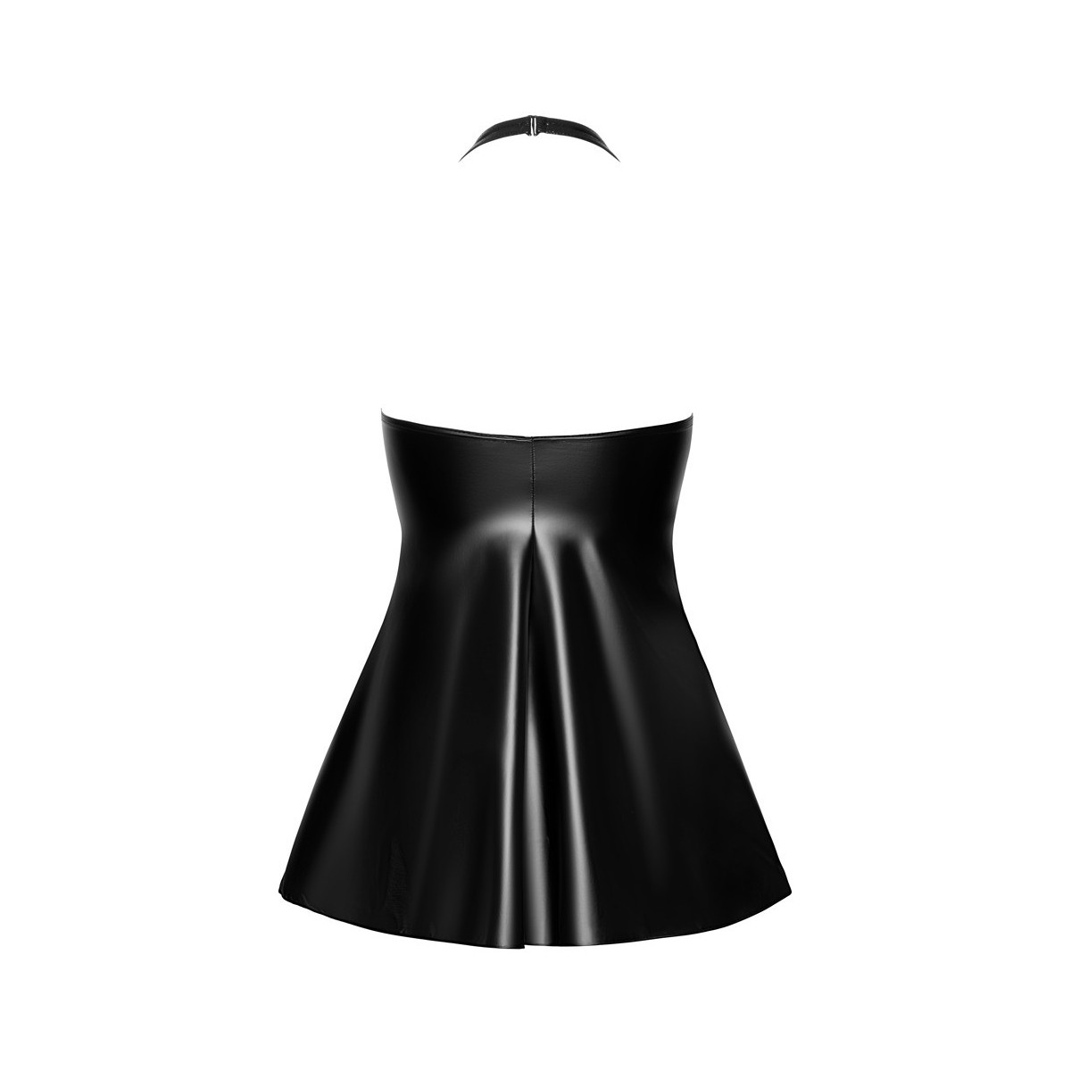 Abito corto di Noir in pelle di serpente opaca (top) e wetlook (gonna). Morbido ed elastico su tutto il perimetro per il massimo comfort. Top aderente ed extra scollato, gonna svasata oscillante. Con collo alto - senza schienale. La zip a tutta lunghezza sul davanti è pratica ed erotica al tempo stesso.