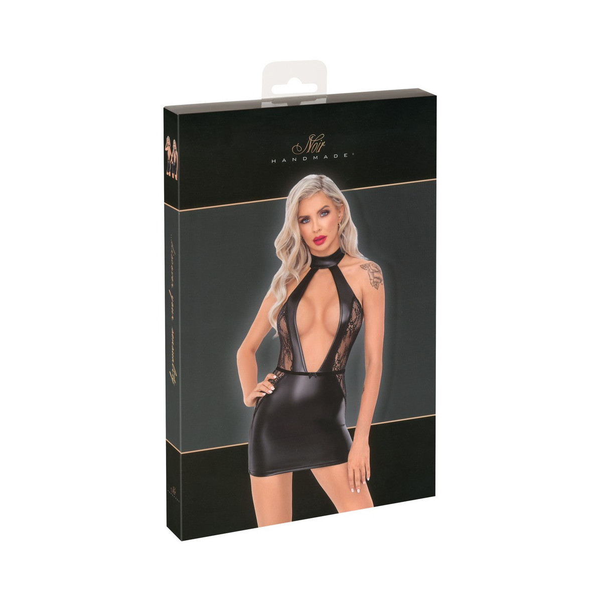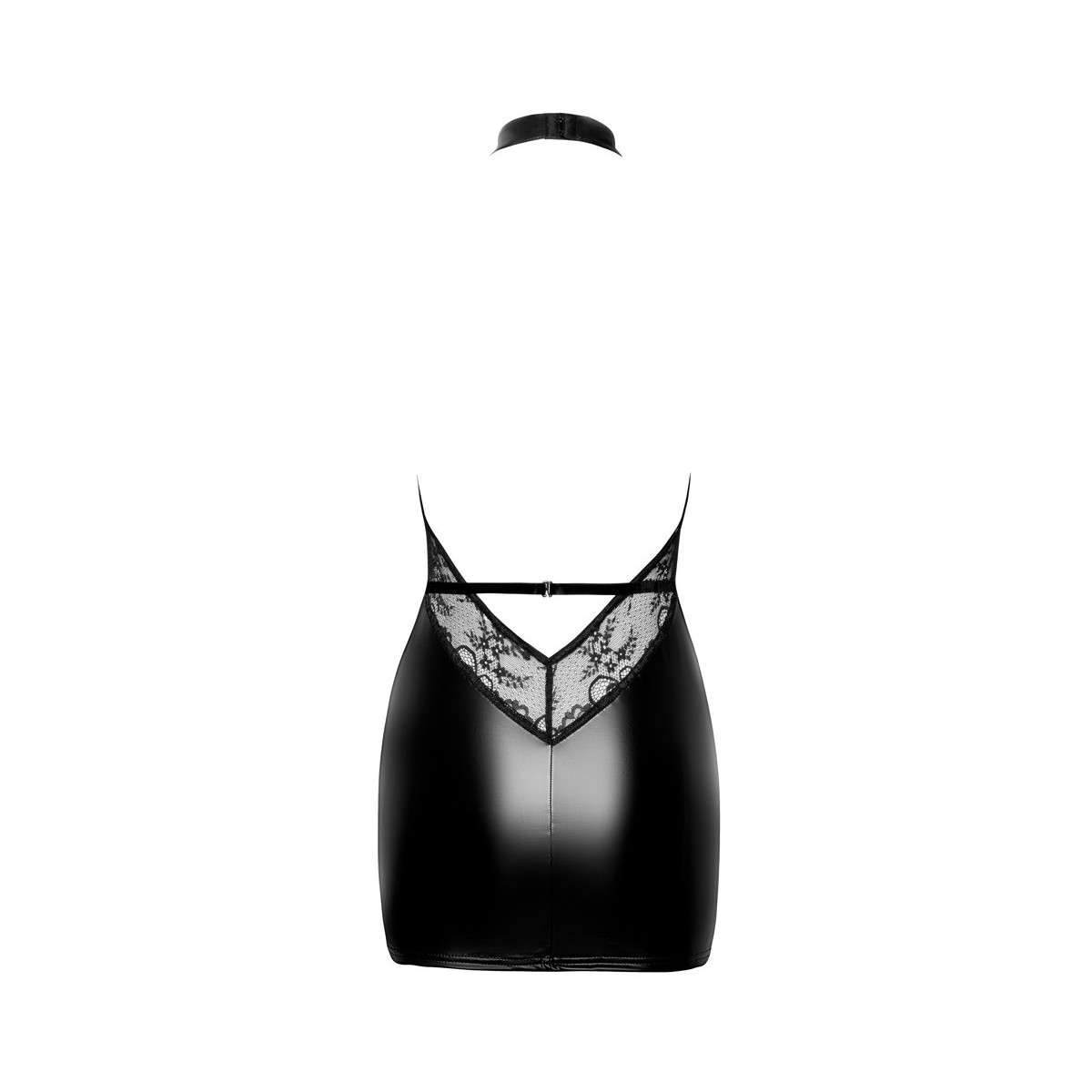 Abito corto di Noir in power wetlook lucido opaco con raffinati inserti in pizzo sui fianchi e sulla schiena. In un taglio eccitante e aderente, con una generosa scollatura fino all'ombelico, la schiena rimane quasi completamente libera. Scollatura e cintura in vita con allacciatura al collo e alla schiena.
