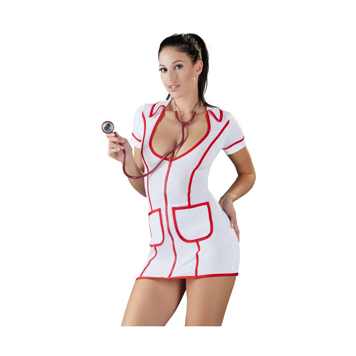 Abito elastico a mezza manica in look da infermiera in bianco con bordino rosso a contrasto e cerniera anteriore completa in rosso. Eccitantemente sexy in un taglio aderente alla figura con una profonda scollatura. Due tasche applicate sul davanti.