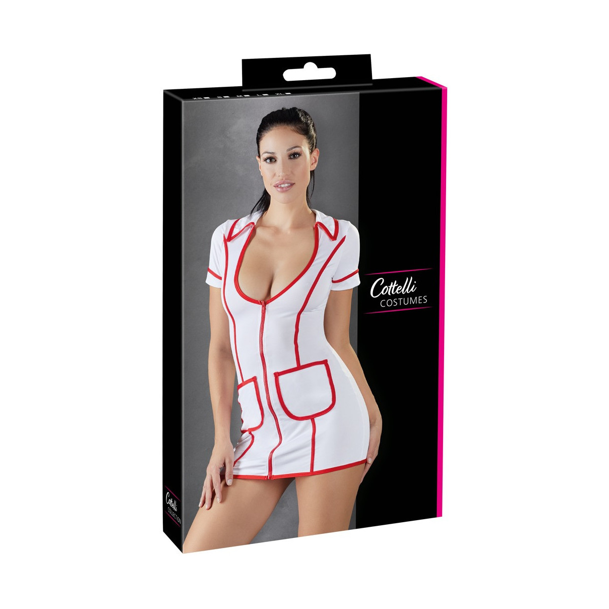 Abito elastico a mezza manica in look da infermiera in bianco con bordino rosso a contrasto e cerniera anteriore completa in rosso. Eccitantemente sexy in un taglio aderente alla figura con una profonda scollatura. Due tasche applicate sul davanti.