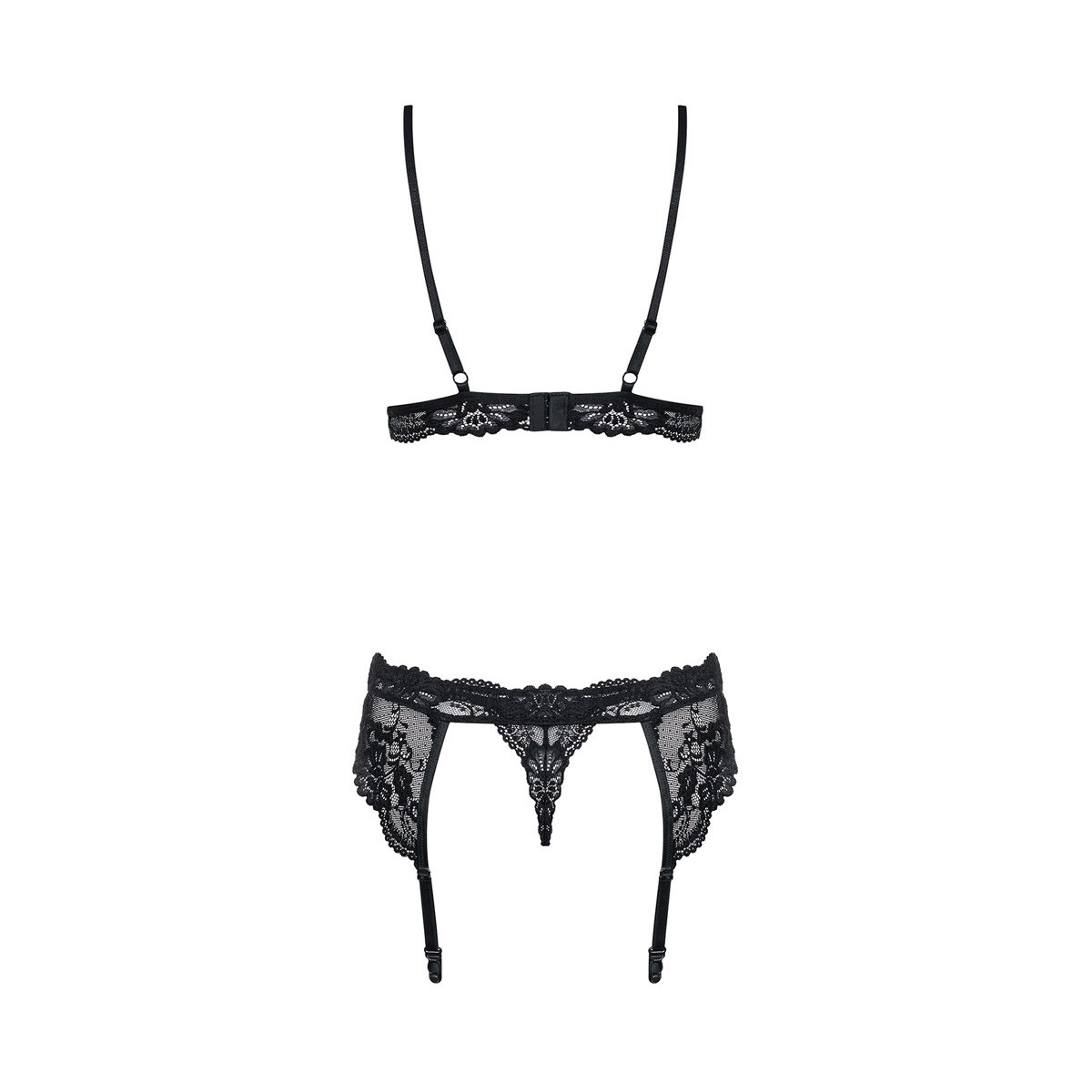 Reggiseno, reggicalze e perizoma in un set di seduzione in 3 pezzi in fine pizzo nero. Cinghie e bretelle regolabili.