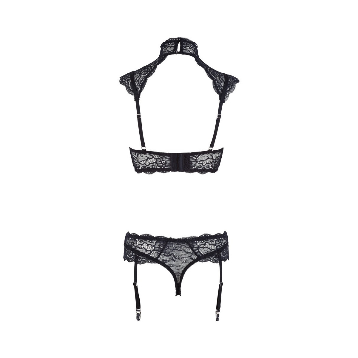 Sensuale reggiseno con ferretto in pizzo di fiori con anelli decorativi e spalline regolabili al collo. Le spalline regolabili affascinano con delicati dettagli in pizzo che convergono sulla clavicola per formare un ampio collare. Con chiusura a gancio sul retro e 2 bottoni come chiusura a collare. Il perizoma in pizzo abbinato ha bretelle regolabili e rimovibili.