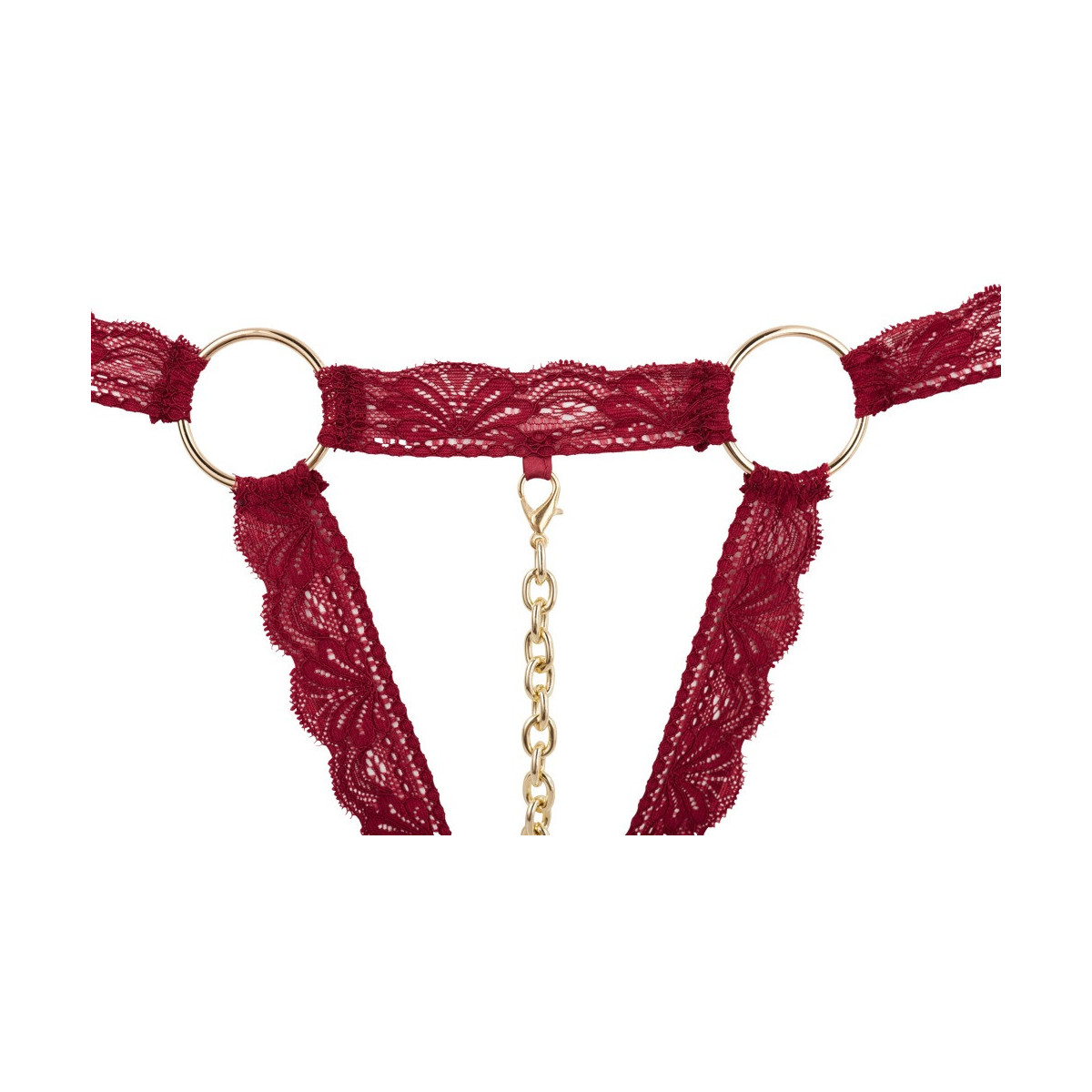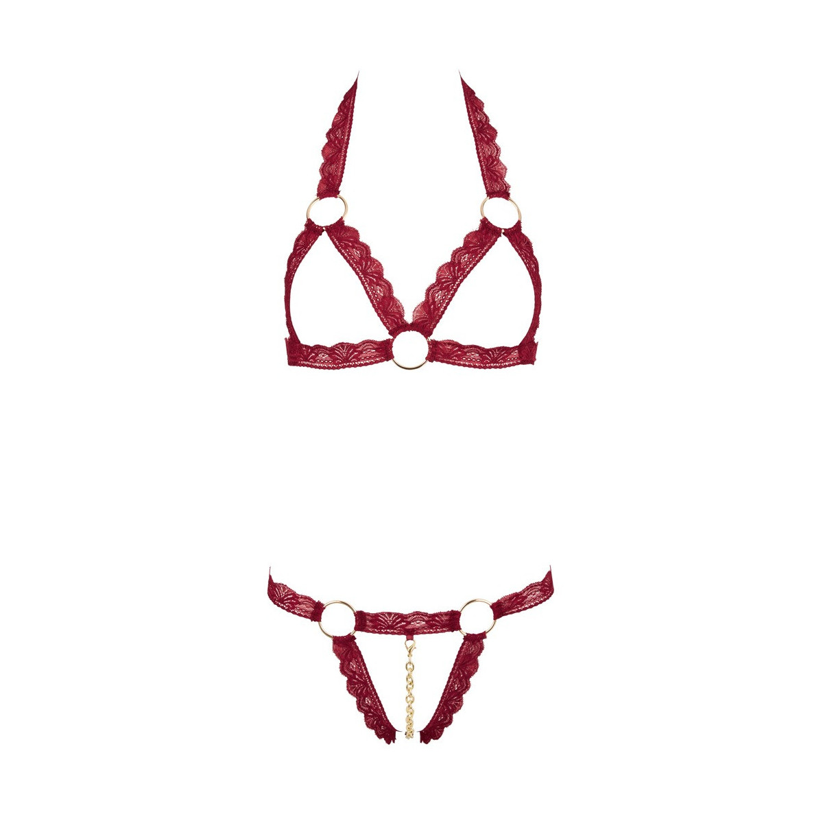 Set reggiseno in pizzo elastico con anelli metallici decorativi. Le coppe sono completamente aperte, la corda si presenta con una catena rimovibile attraverso il cavallo aperto (moschettone ad ogni estremità). 90% poliammide, 10% elastan.
